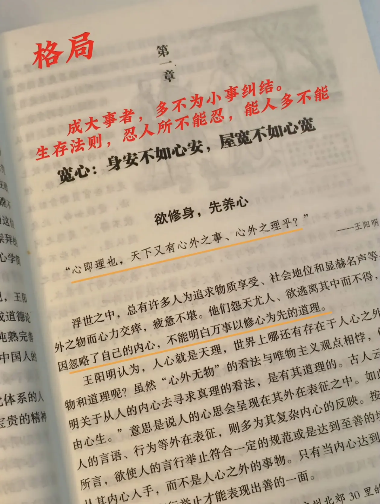 王阳明心学。王阳明说:宇宙万物,本无善恶,为人心之所向,使之有别。观花者言花美,食草者赞草香,此皆心之所在,意之所至。心乃万事万物之主宰,心境之变,便是世界之变,烦恼与忧虑不过心魔一时迷惑,情绪之波动亦是内心修为之所显。开阔心胸,宽容以待,看淡得失,方显慧根。心宽则失宽,心淡则情淡,悟透生命,豁达自如。