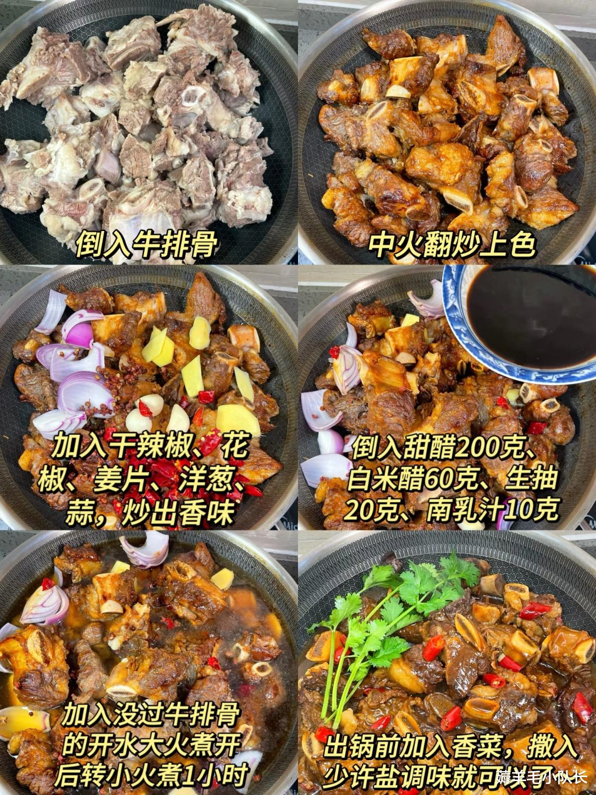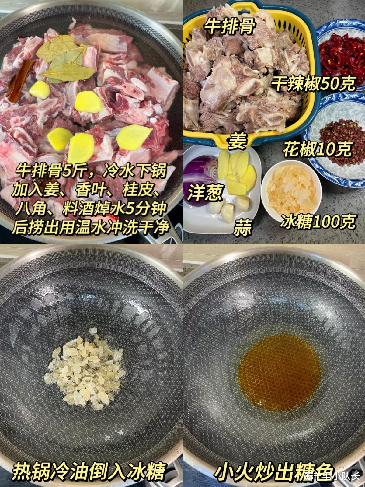 牛排骨,50克干辣椒,10克花椒,洋葱、姜蒜,100克冰糖,香叶、八角,甜醋、白米醋、南乳汁。