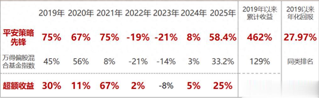 数据显示,他管理的平安策略先锋混合(700003),截至2025年12月31日,自2019年以来累计收益率462%,年化回报27.97%,同类排名2/113;更难得的是,过去七个完整年度中六年跑赢偏股基金指数,超额收益达333%。