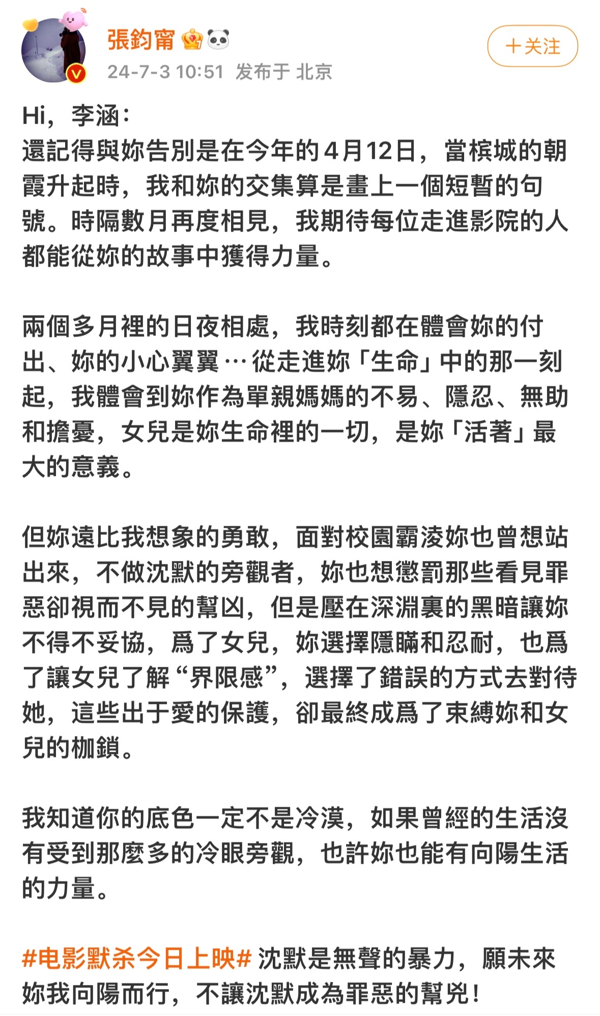 #张钧甯写给李涵的信# 在张钧甯这里看到了演员对自己塑造的角色最好的共情状态和感受,这封站在角色外对话的信细腻又有力量!也确实只有真的吃透角色的才会有这么深入的理解,张钧甯用演技也证明了自己对角色的领悟,默杀大卖!