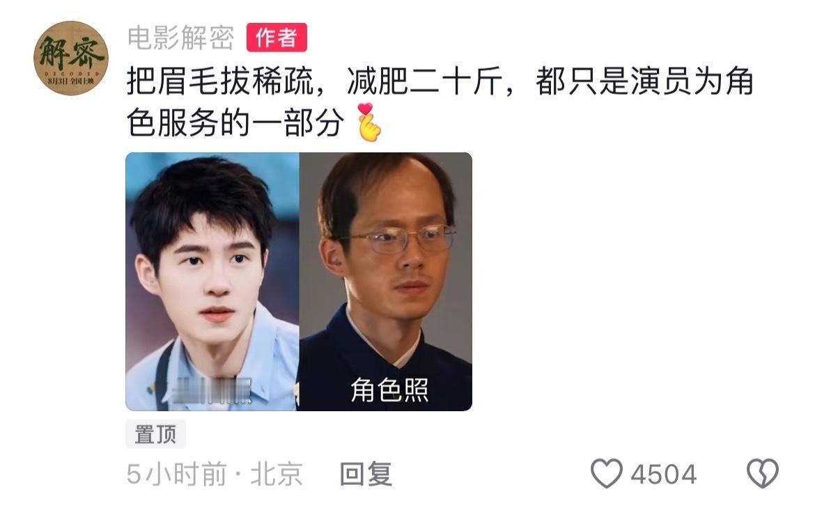 #刘昊然为新戏拔了头发眉毛# 被《解密》今天定档预告里的刘昊然惊到了,为了角色真的付出了好多,看花絮里介绍原来是拔了头发眉毛,怪不得连麦家都直言“太不刘昊然了”,造型的突破真的太颠覆了,期待在电影院和容金珍的见面!