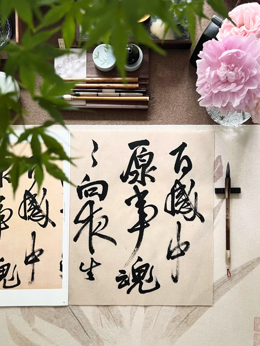 这一次的开始很艰难,重新拿出学书法的di一支笔,前五行不知道写了多少遍,都找不到“感觉”,知道手在写,但是不知道在写什么。开篇的“怀州”二字的细细牵丝的部分,怎么都找不到发力点,写不出紧绷的张力。
