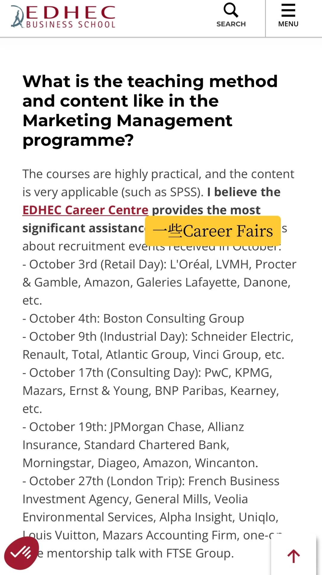 接上条,我对课程没有期待是因为我知道商学院能给我最大的帮助就是在简历Education一栏出现学校名字。EDHEC的Career Service在2023 FT排名上全法第一,从9月到次年3月都时常会举办大型的Career Fair.