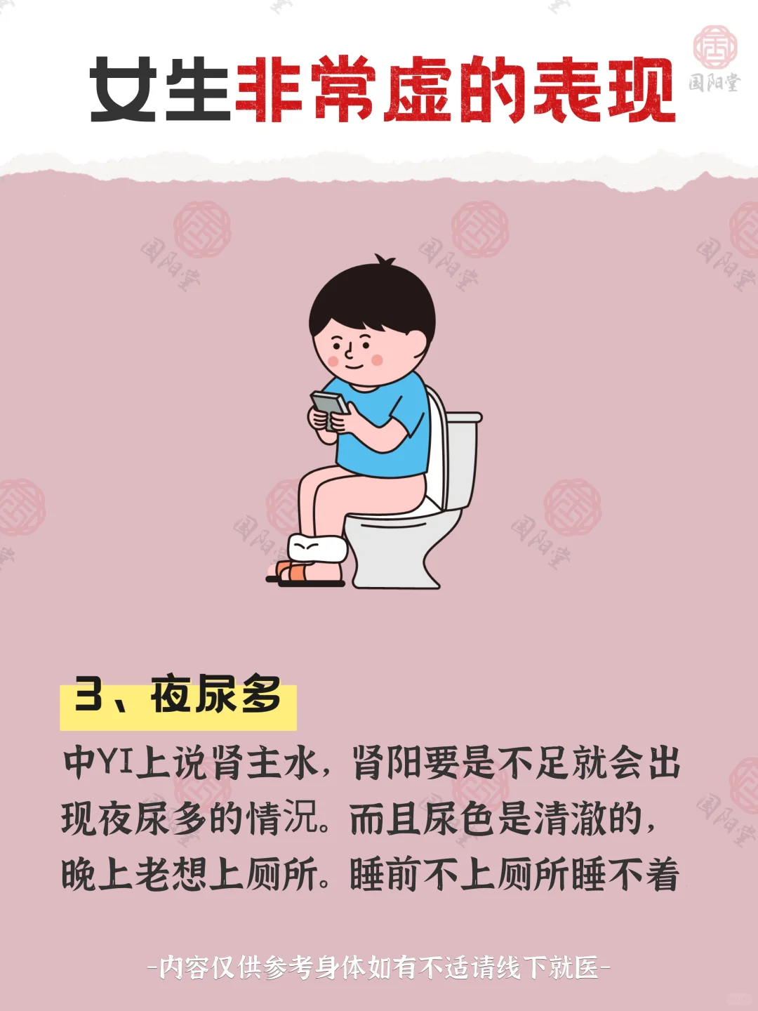 1.嘴巴干 2.掉头发 3.夜尿多 4.白天睡不醒 5.手脚冰凉 6.体力不好