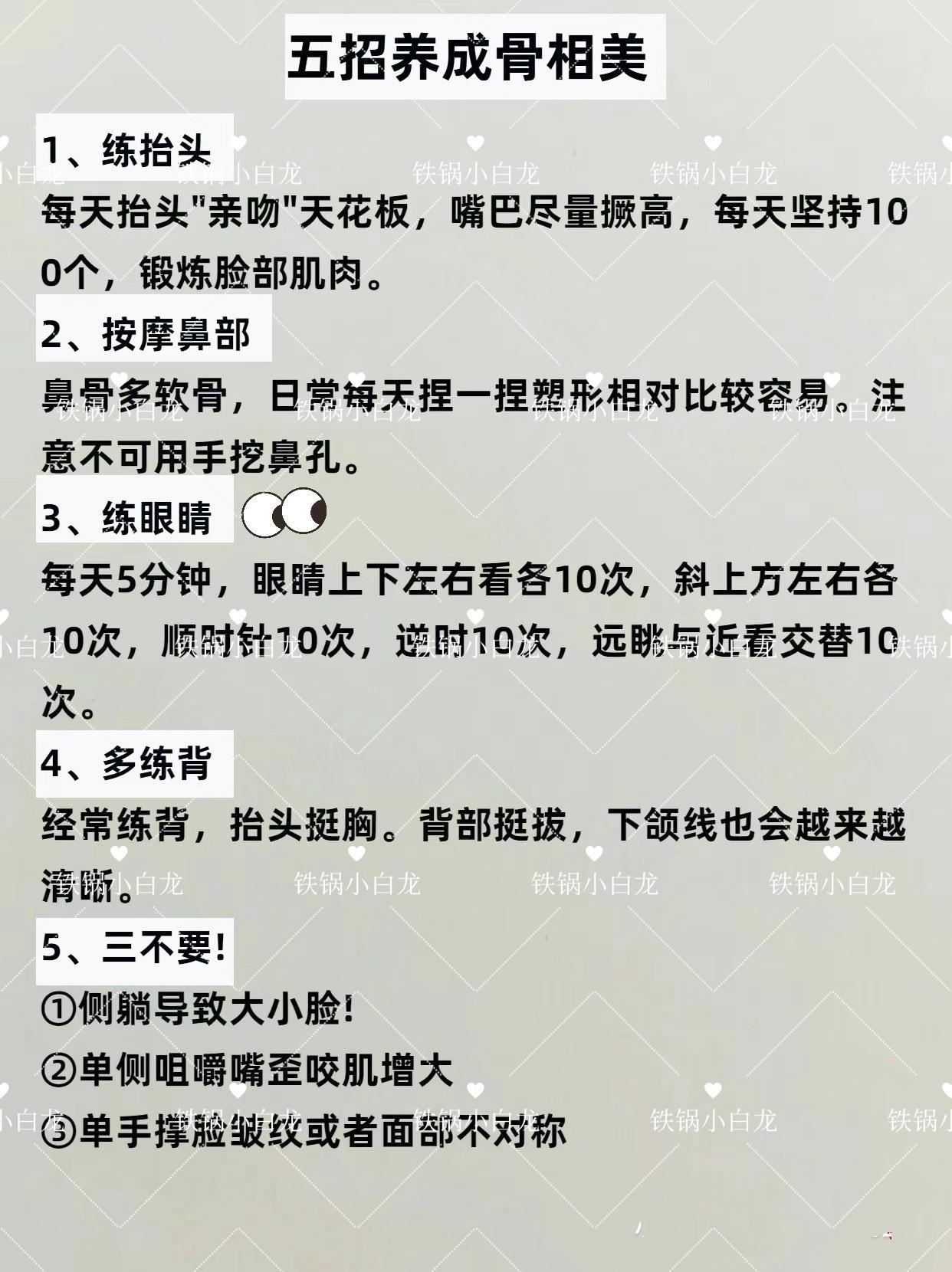 每天抬头"亲吻"天花板,嘴巴尽量撅高,每天坚持100个,锻炼脸部肌肉。②按摩鼻部