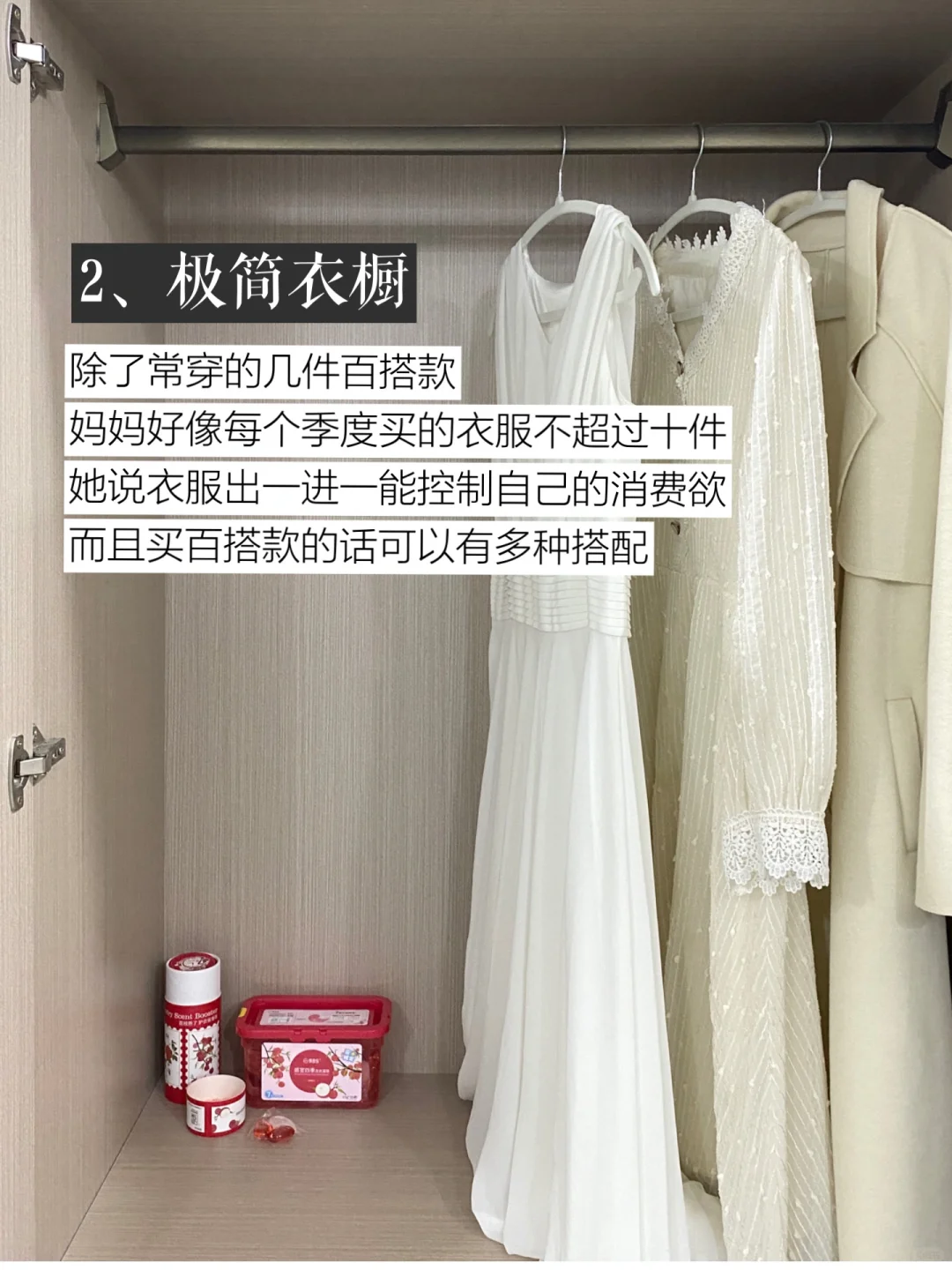 除了常穿的几件百搭款,妈妈好像每个季度买的衣服不超过十件,她说衣服出一进一能控制自己的消费欲,而且买百搭款的话可以有多种搭配
