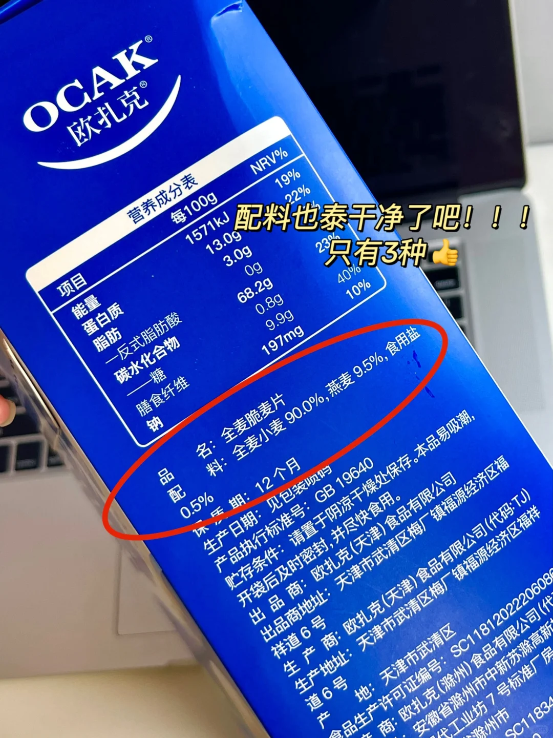 配料嘎嘎干净,只有小麦、燕麦、食用盐,99.5%全谷物!!👍