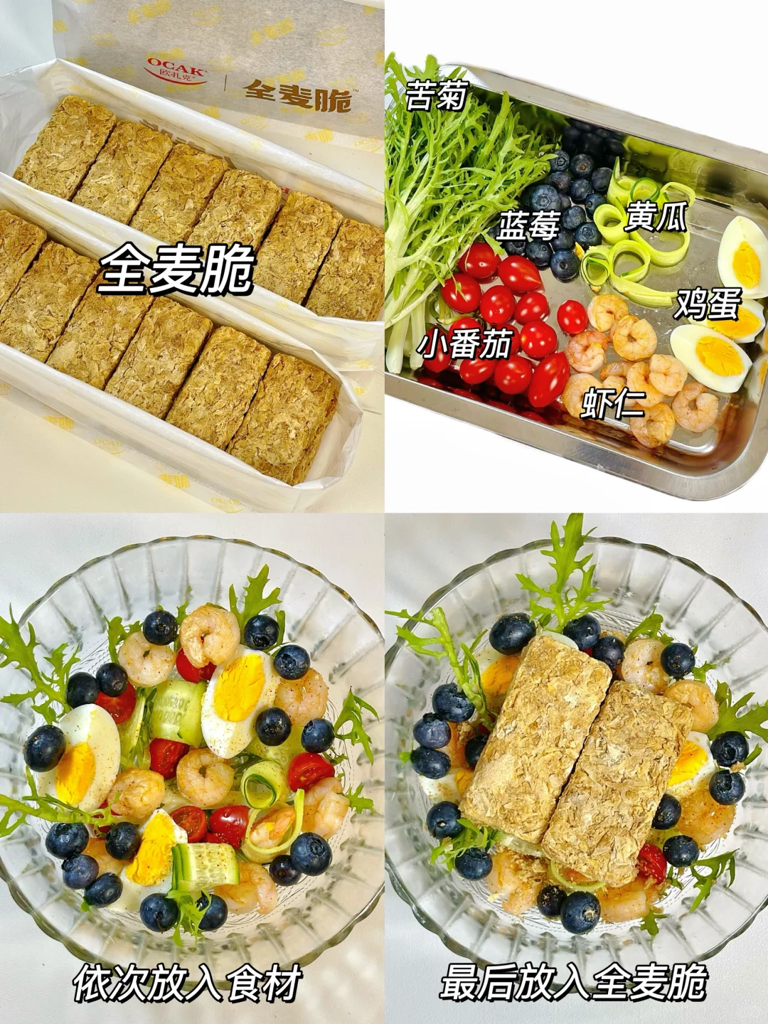 食材:全麦脆、虾仁、鸡蛋、黄瓜、蓝莓,还可以放自己喜欢吃的其他水果。