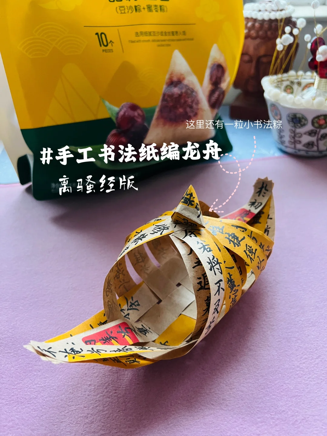 💠血脉的觉醒仿佛就是在30以后 ❄️喝茶写字,用古人的方式养生,才发现红润不是骗人的。 💠泡一壶花香肉桂,听着淅淅沥沥的小雨声,写一页赵孟頫,拿起笔的那一刻,享受动静快慢间的酣畅之感。 ❄️真心建议入门的姐妹选赵孟頫(P5) [樱花R]侍弄花草会让人不自觉的开心,或许是感受到了成长的魅力,就像写字,内心的舒畅皆在每一笔的掌控力。 💛端午的小快乐就是吃粽子(P6) 🧡推荐大家都来试试豆沙粽,超级软糯,一点都不甜,适合控糖的姐妹,缺点就是不单卖,和小枣混合装。 [种草R][种草R][种草R] 附书法竹编龙舟制作过程(P7): 🔹用牛皮纸外卖袋diy,裁出11个小纸条 🔹写上喜欢的内容,端午我选了更搭的离骚经 🔹横向4条,纵向6条,用压一挑一的方式编 🔹把横向两端分别粘贴在一起 🔹纵向同理,而后将两端粘在一起 🔹用一张小纸条折出粽子放船顶