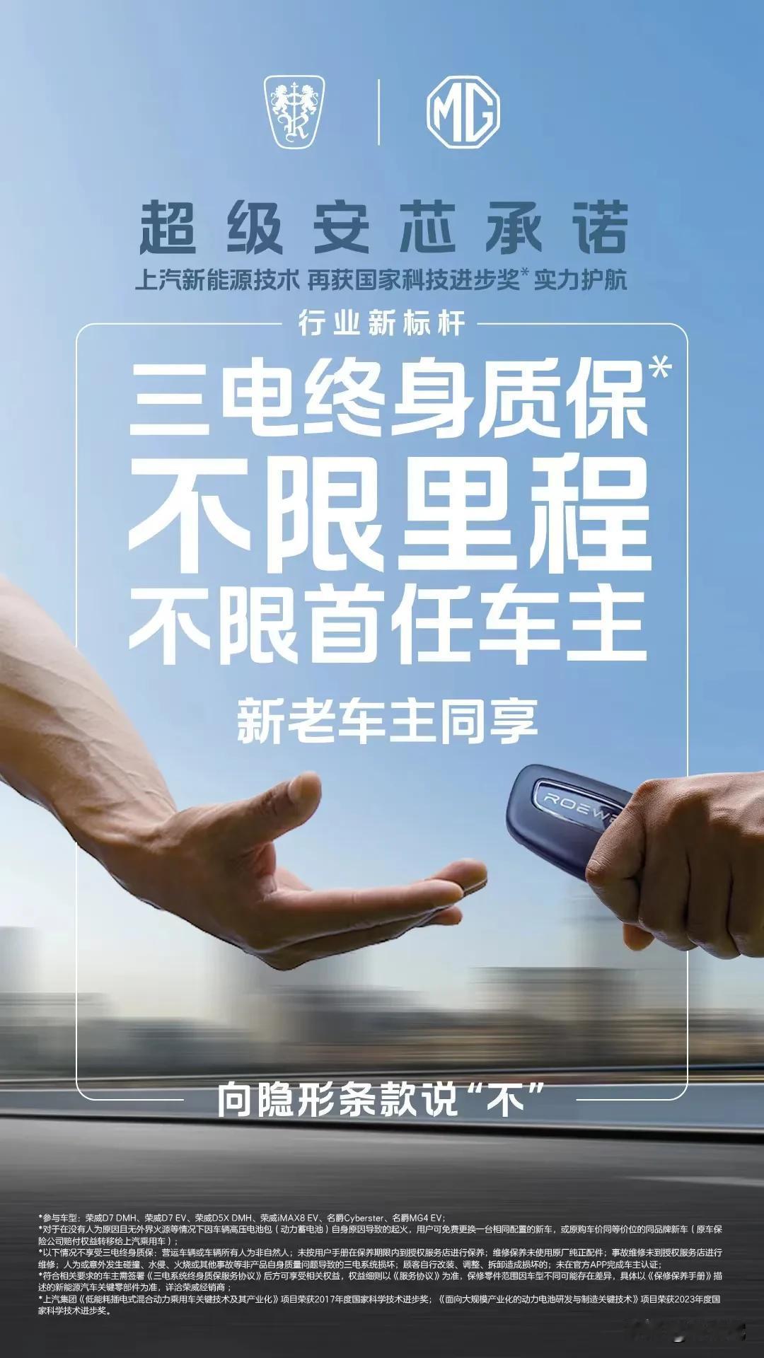 惊艳荣威售后保驾护航!三大超强保障,零燃保障”、三电终身质保”,让您无忧畅享驾驶激情!上汽荣威的口号响彻云霄:零燃保障”,这是行业顶级标准!毋庸置疑,上汽荣威这个新年头大招就是让你拥有全新的买车体验!从现在起,购买荣威新能源汽车,品质将是你的首选!而就在7月4日,荣威再次宣布重磅消息,成为国内唯一提供如此强大售后保障政策的车企!这项政策包含了零燃保障”和三电终身质保”等多项内容,覆盖了荣威多款热销车型的非营运车主,包括荣威D7 EV、荣威D7 DMH、荣威D5X DMH 以及荣威 iMAX8 EV 等车型。更令人惊叹的是,荣威承诺新老车主同享”!在市场竞争激烈的今天,有些车企却试图通过降低售后成本来逃避责任,但荣威,作为国家队,坚决不走这条路!荣威承诺,无论是新车车主还是老车主,无论是首任车主还是非首任车主,都能享受零燃保障”和三电终身质保”,而且没有里程限制!荣威超级安芯承诺权益政策的发布,无疑打破了新能源汽车售后保障服务的天花板。这样的荣威,怎能不让人热血沸腾? 注:内容来源于网络,若与实际情况不相符或存在侵权行为,请联系删除