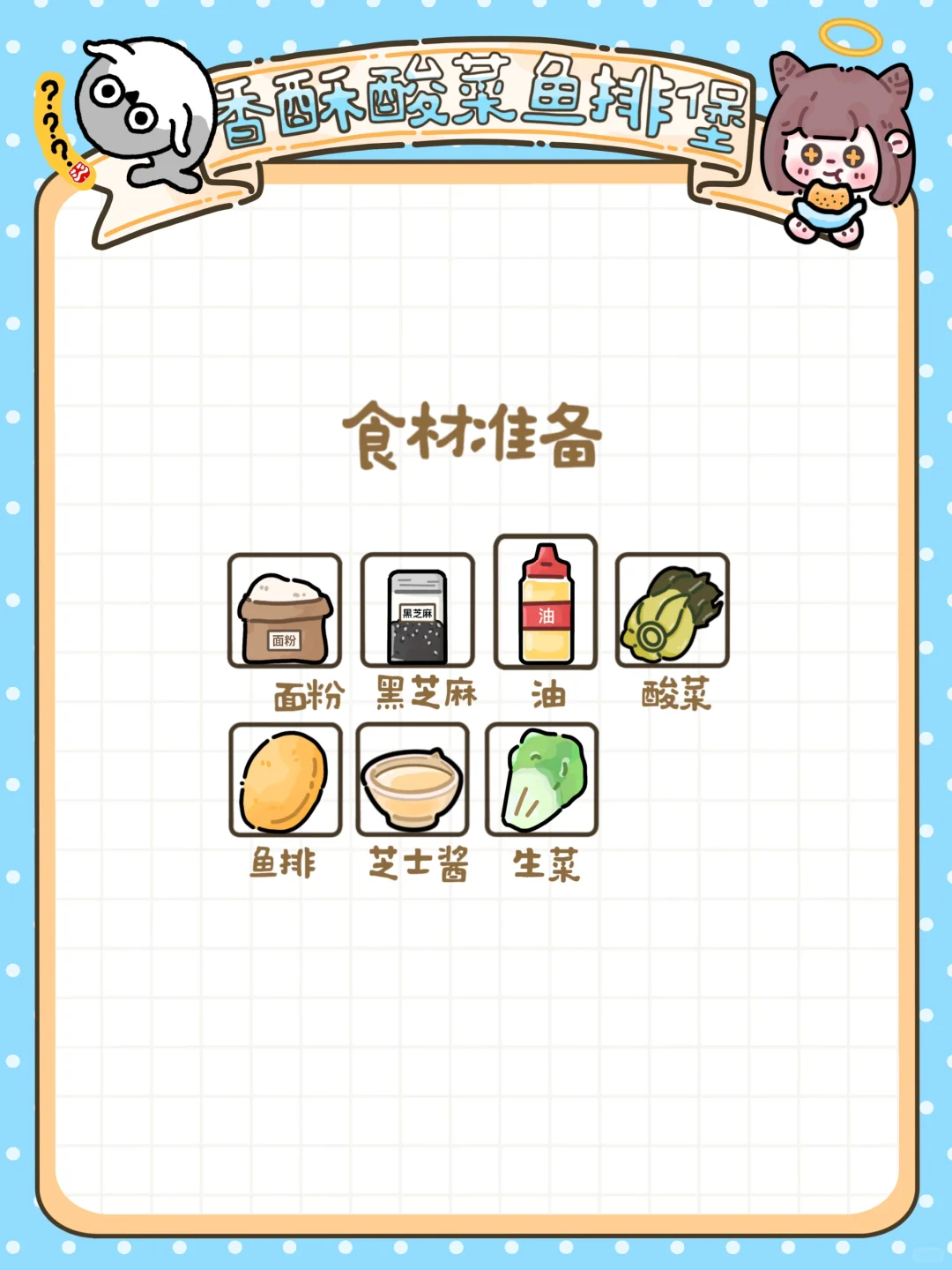 面粉|黑芝麻|食用油|酸菜|鱼排|生菜🥬|芝士酱🧀