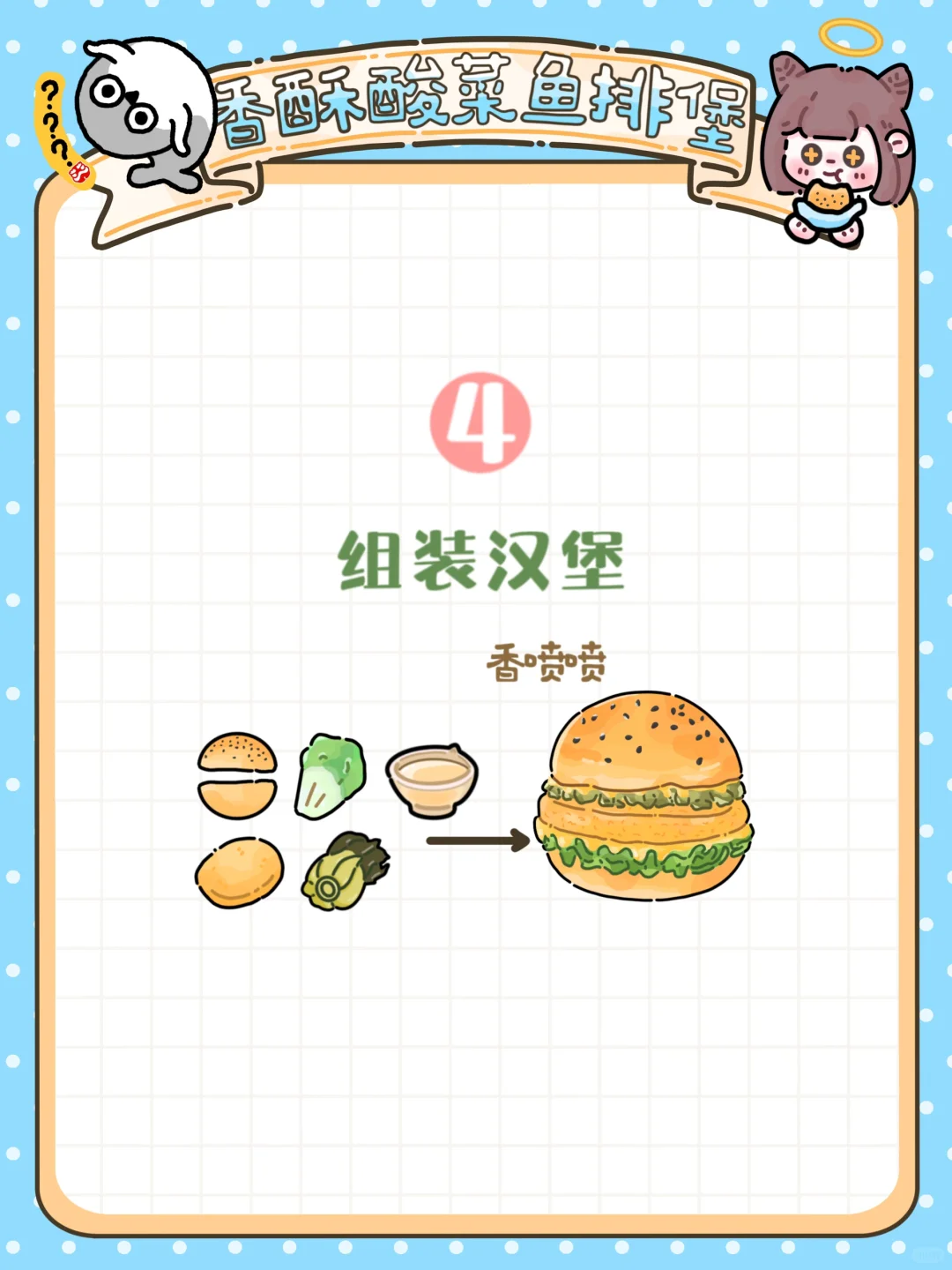 3️⃣饼皮➕生菜🥬➕🧀芝士酱➕鱼排➕酸菜➕🧀芝士酱➕饼皮组装