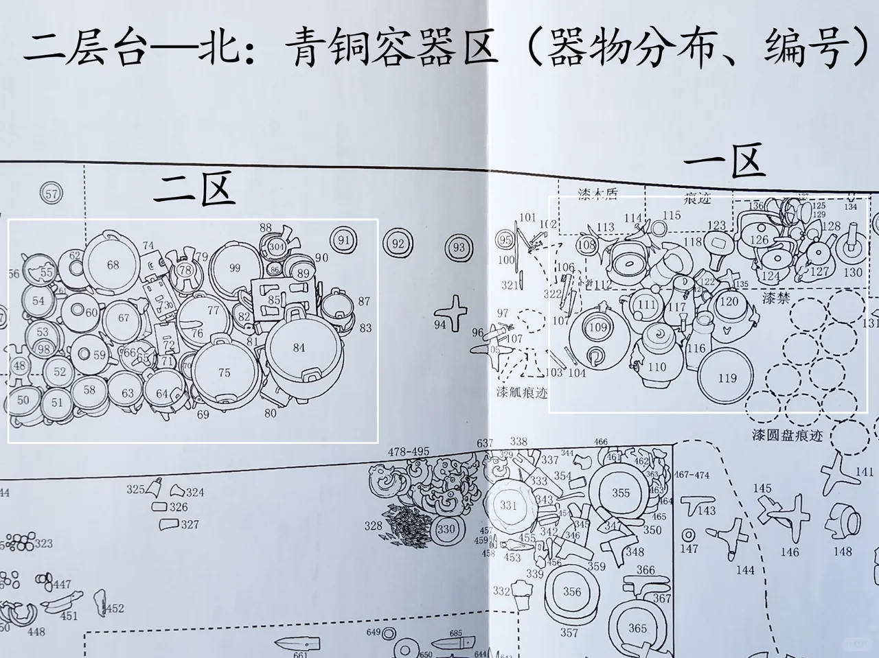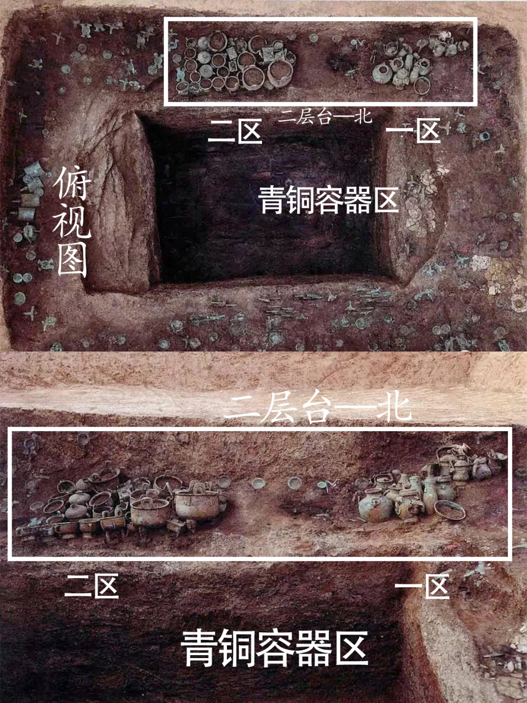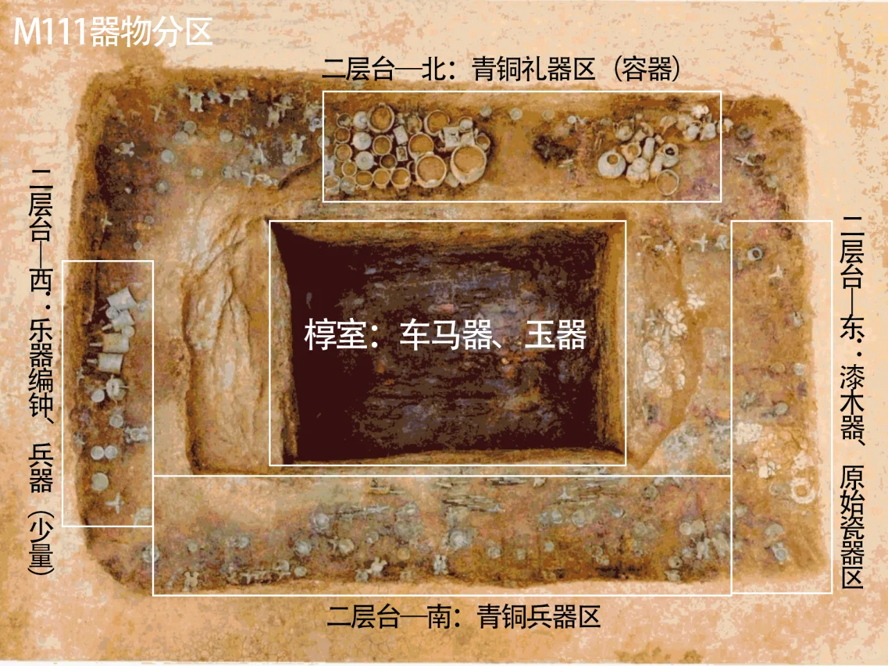 信息:该墓主要陪葬器物在二层台,二层台—北:青铜礼器区(容器)、二层台—西:青铜乐器(编钟)区有少量铜兵器、二层台—南:青铜兵器区、二层台—东:漆木器、原始瓷器区、椁室:车马器和玉器。