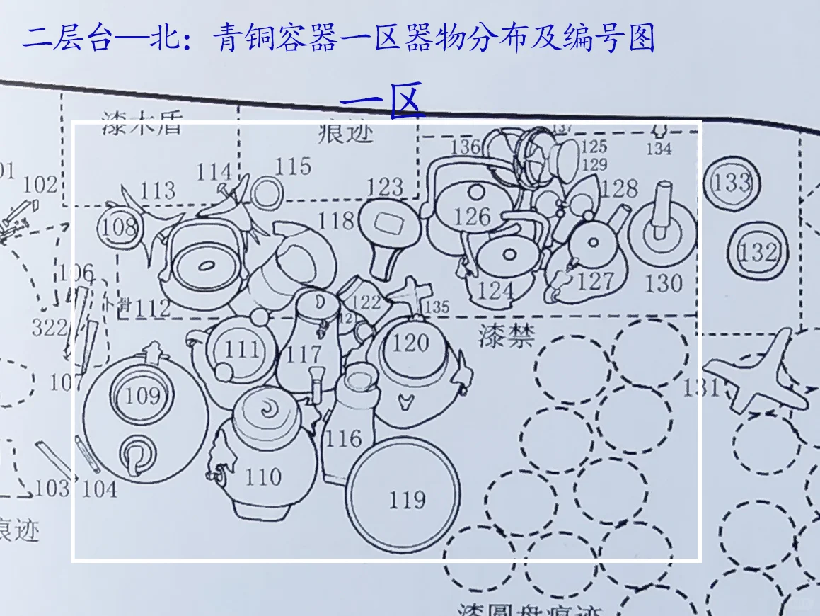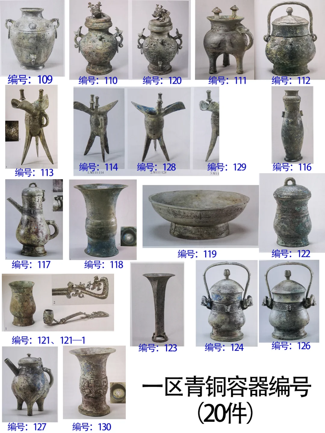M111青铜器显然可以划分为三组,即二层台—北:一区、二区各为一组,二层台—西:青铜乐器为一组,其中青铜礼器(容器)一区、二区为本文重点。