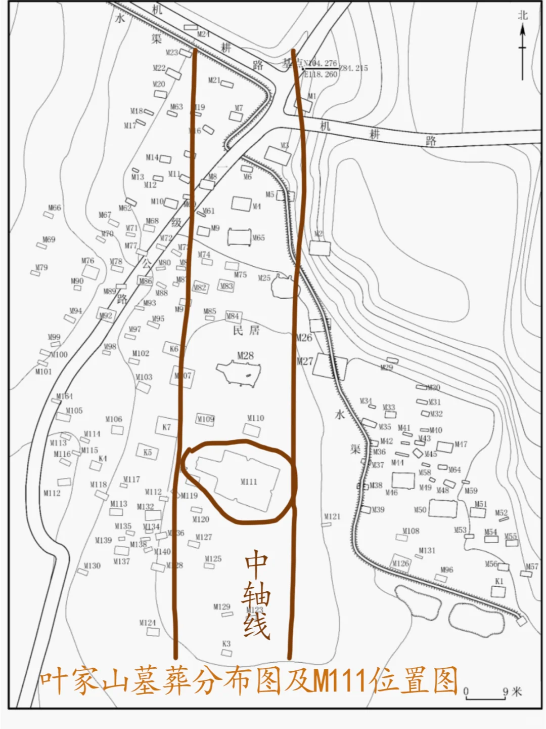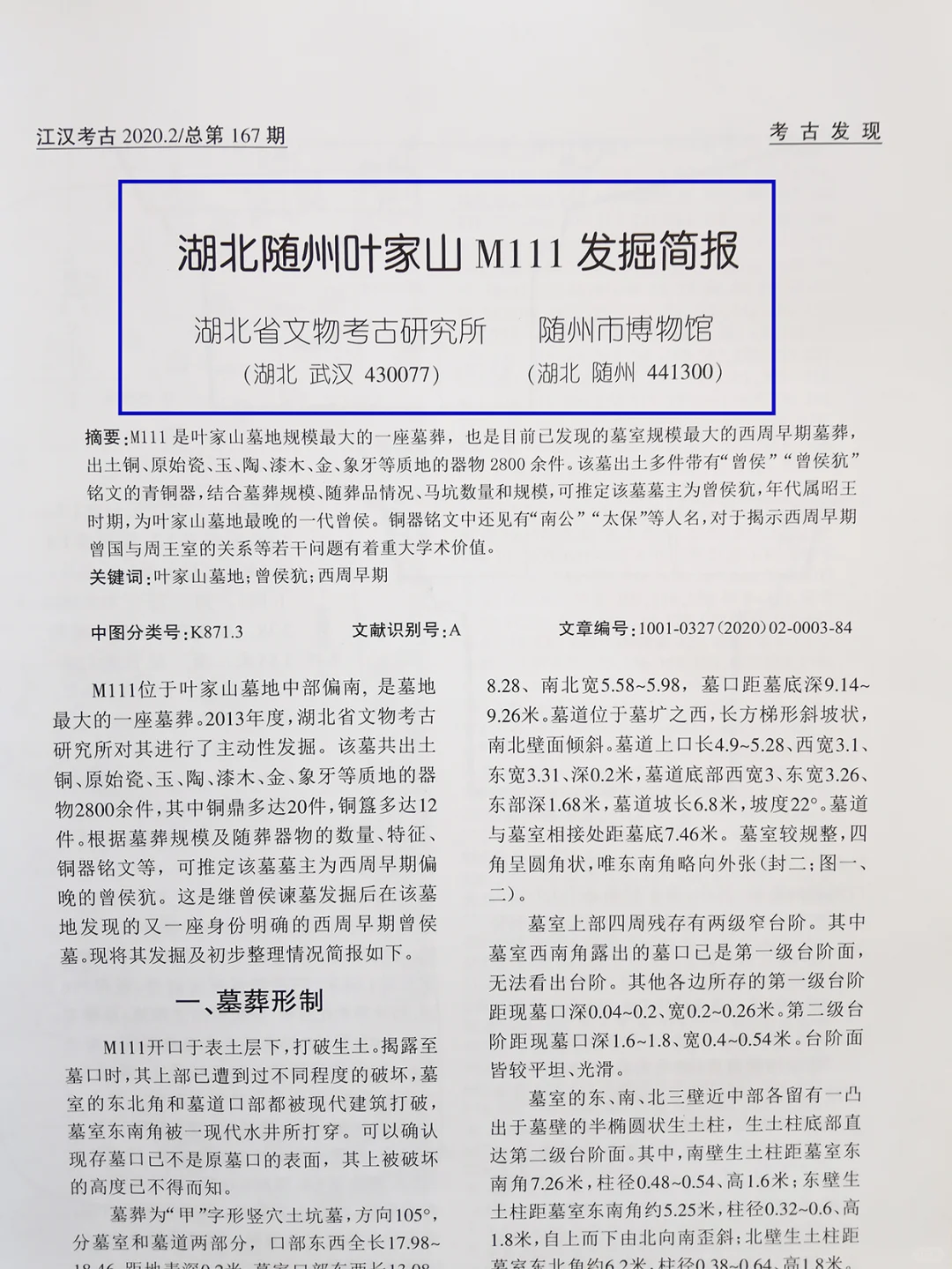 信息:M111在该墓群区位于中轴线上且墓葬面积最大,陪葬品最多;也是该区唯一出土多件青铜乐器的大型墓葬,综合来看,M111应是一位“曾”侯墓。