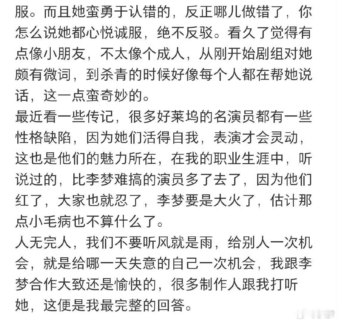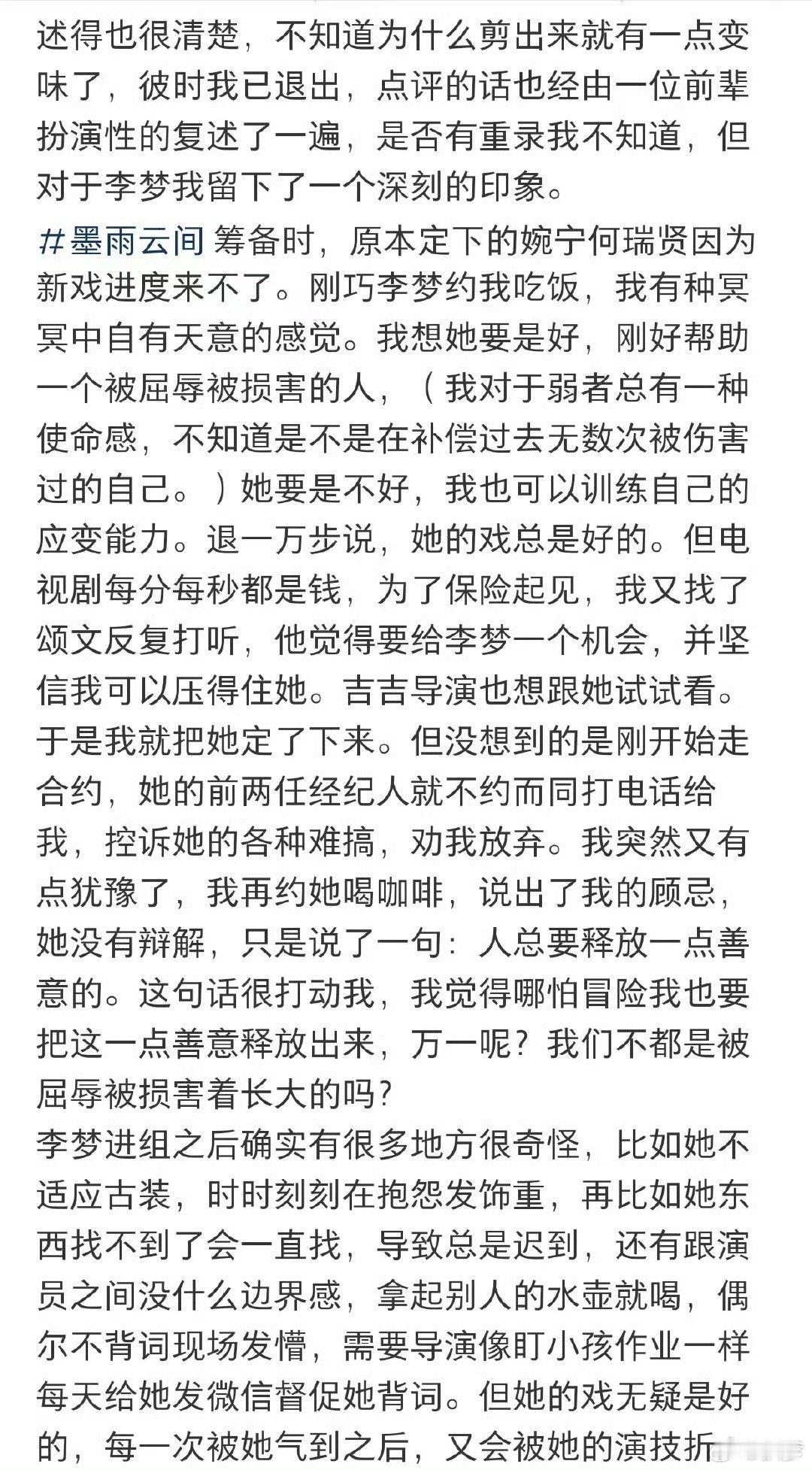 于正发长文聊李梦,称李梦前经纪人控诉其难搞,进组后存在抱怨发饰重、总迟到、随便拿