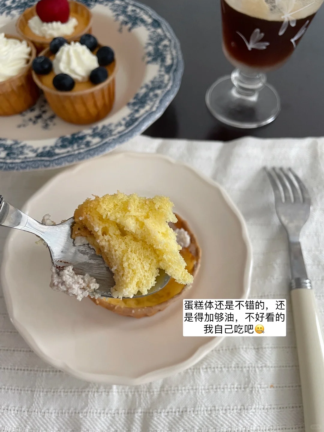 🧁cupcake达成 不难,就是别瞎加东西进奶油里[失望R]纯奶油顶新手比较好把握。 油量要够,之前做麦芬减油吃着很噎。这次戚风胚完全按照配方放了32g植物油!果然油润不少~