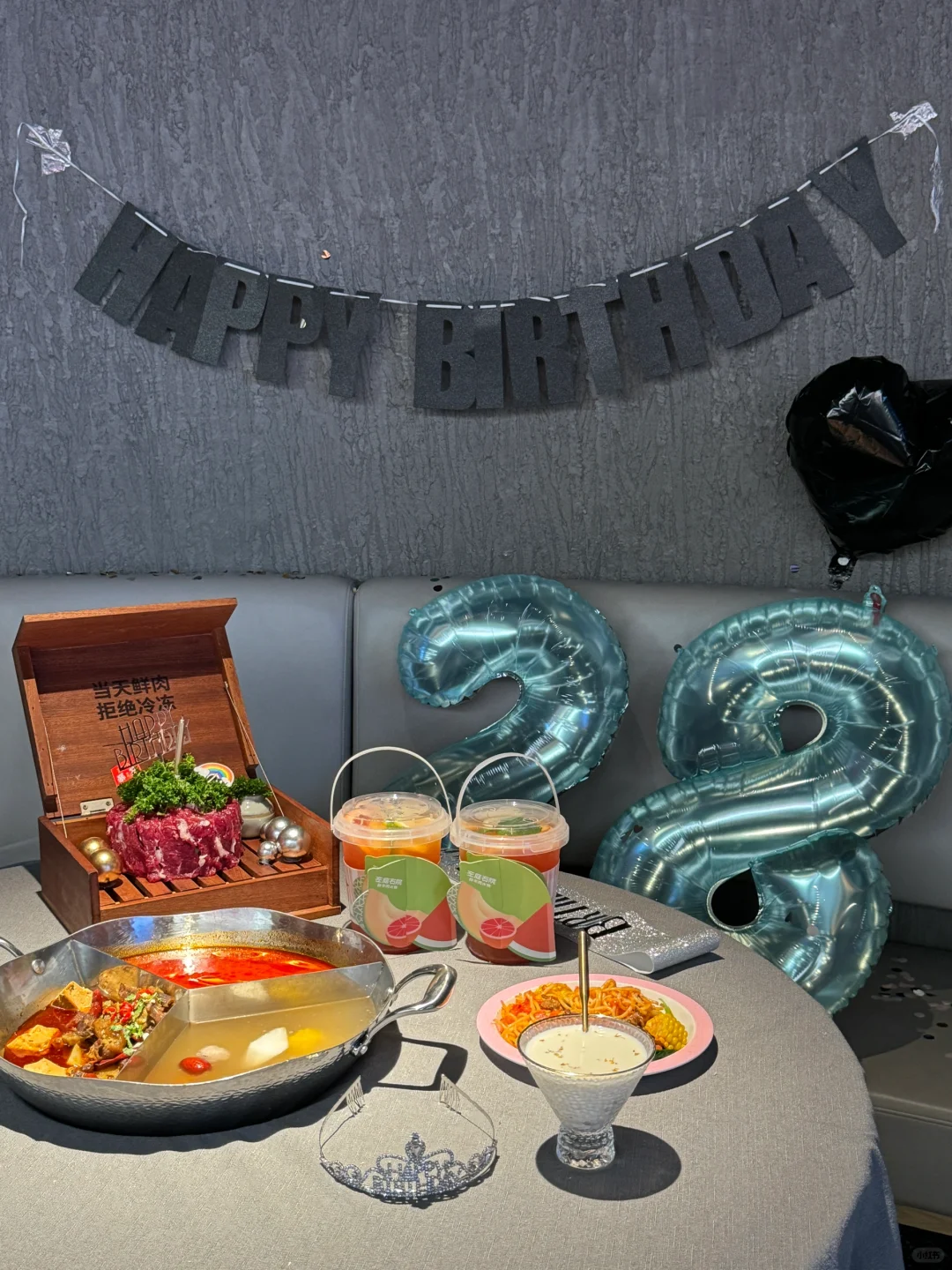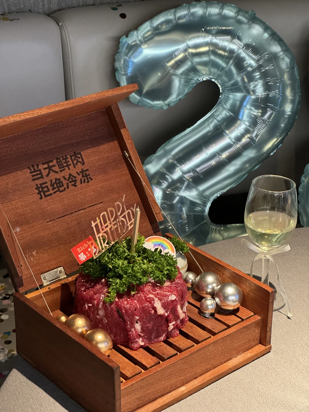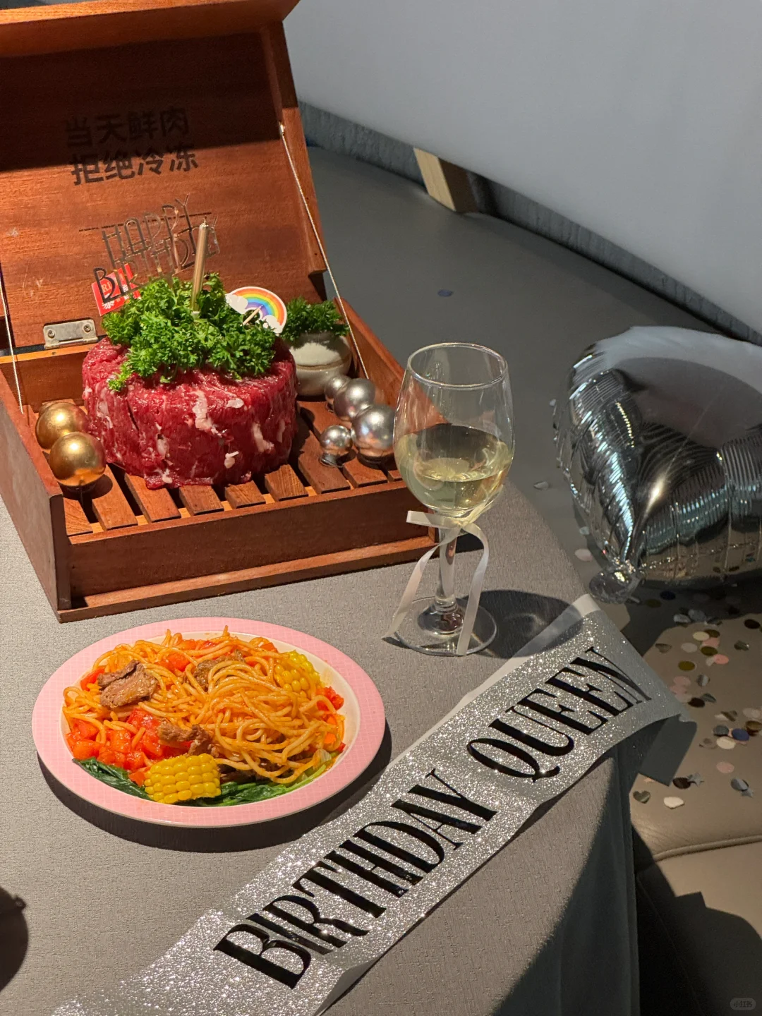 自己布置的生日现场也太喜欢啦~ 横幅、气球、小皇冠👑…好有氛围 还有坠特别的鲜牛肉蛋糕hhh 也太用心喽 爱我的姐妹们!!