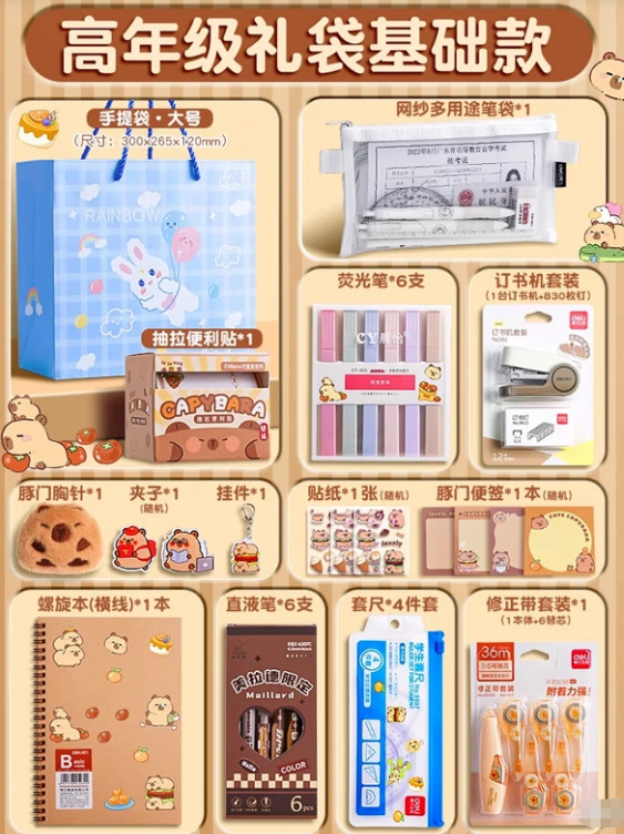 它不只是简单的文具组合,更是一份充满仪式感的开学礼物。把礼盒送给孩子的同时,还能和孩子聊聊新学期的小目标,用这份小惊喜传递学习的鼓励,让孩子感受到新学期的仪式感,带着满满的动力开启校园生活,还能在互动中拉近亲子距离,实用又有意义。
