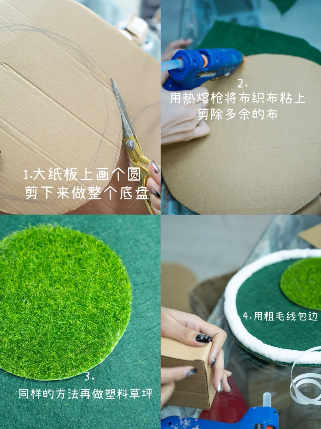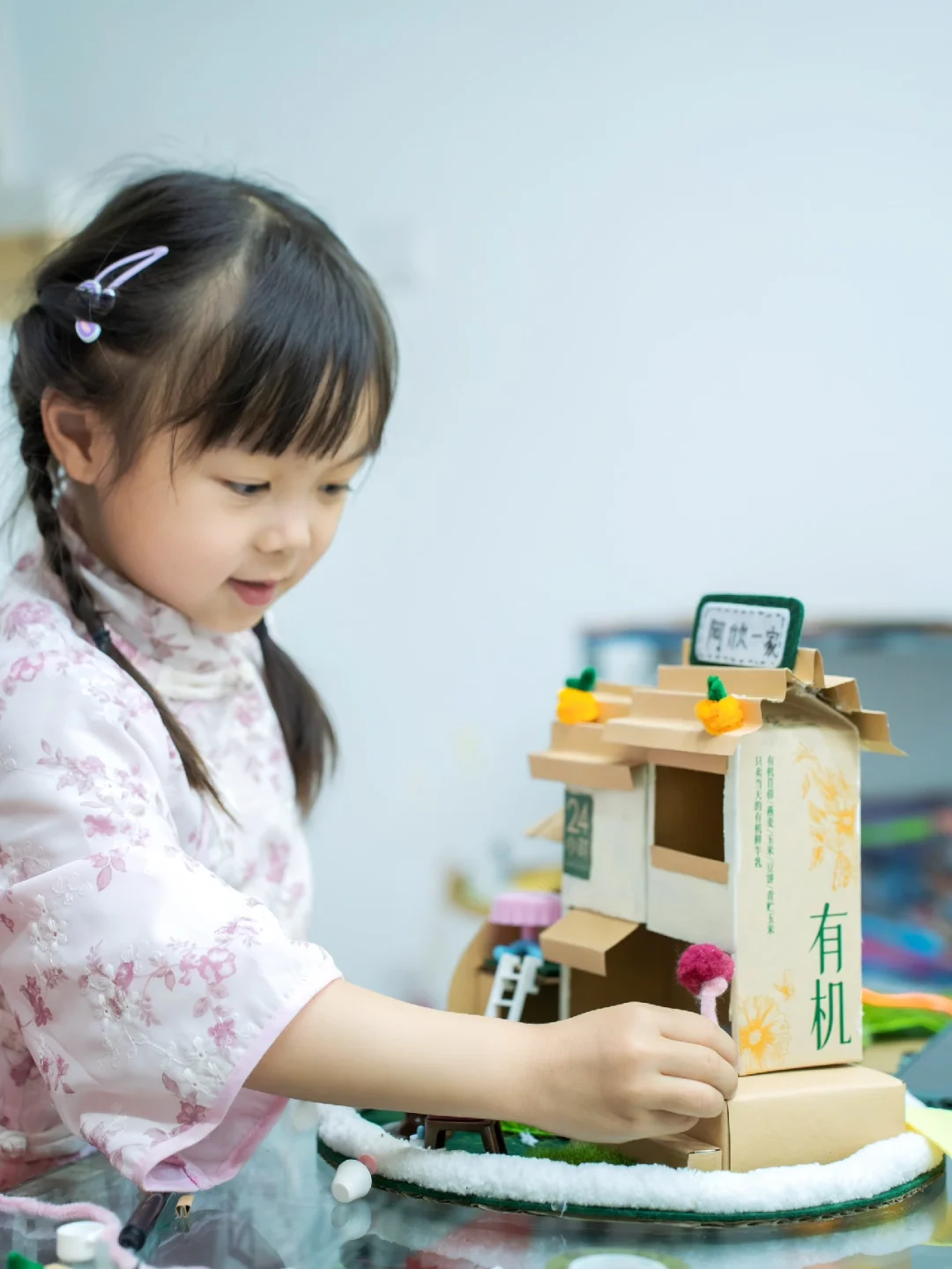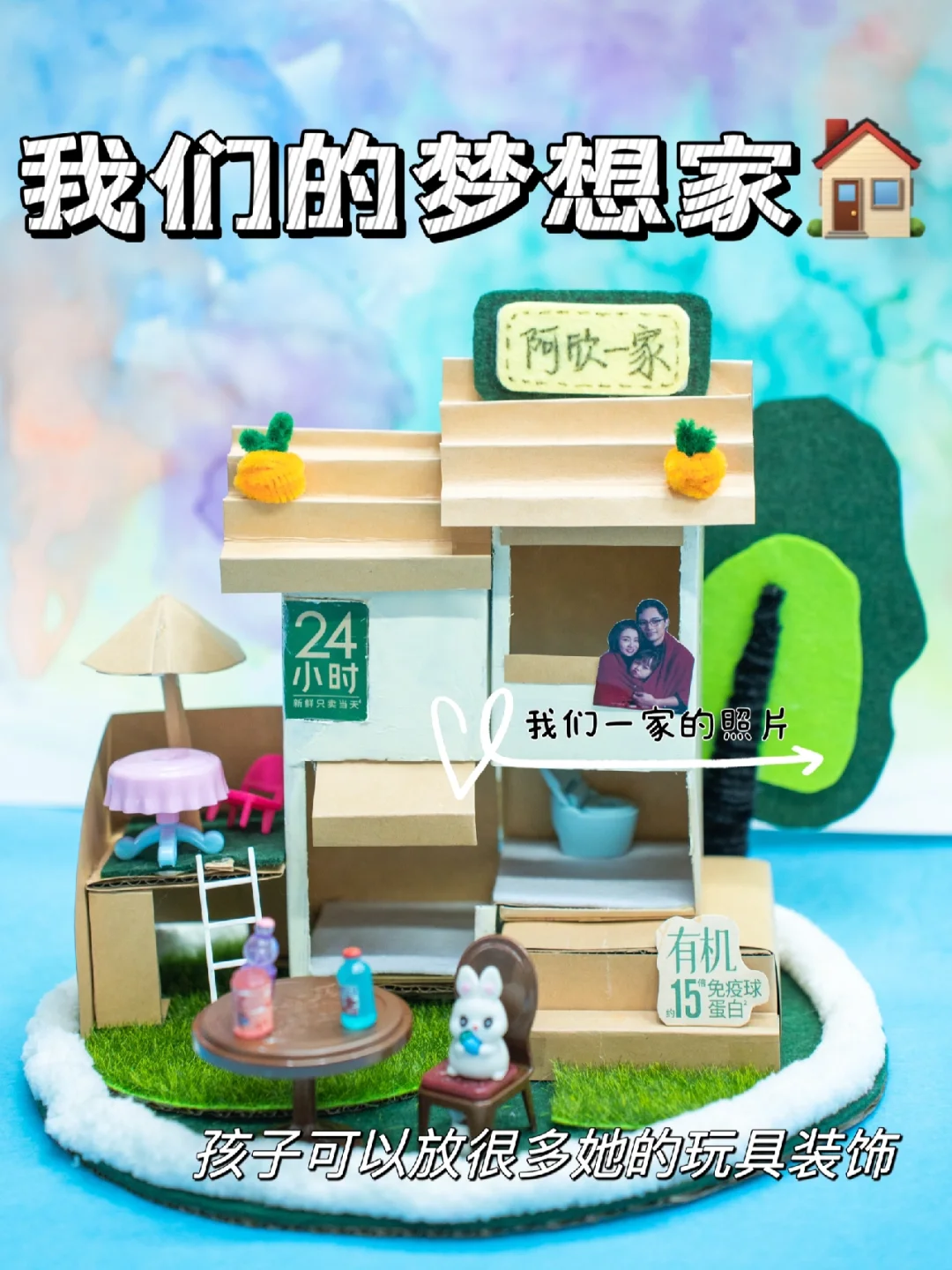 与女儿的约定在今天实现了~ 答应了很久陪女儿做个手工房子今天终于开动了~ 你的创意,妈妈帮你一起实现~因为我们平常爱喝这种大瓶的鲜奶,每天早上全家一起喝完新鲜牛奶后就将盒子保存了下来~ 就用它来做我们的大框架吧 准备材料: 牛奶盒 布织布 牛皮纸 纸板 剪刀 直尺 粗毛线 塑料草坪 热熔枪 双面胶 🔆步骤如图示☝️ 和孩子一起做专属你们的大house吧~