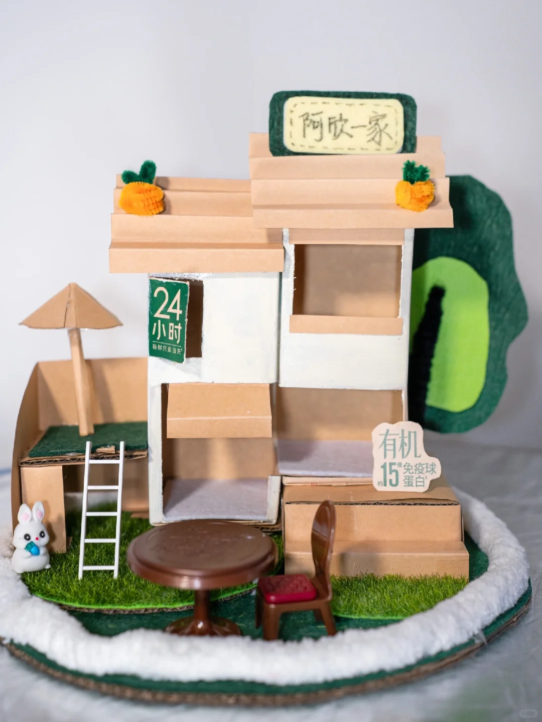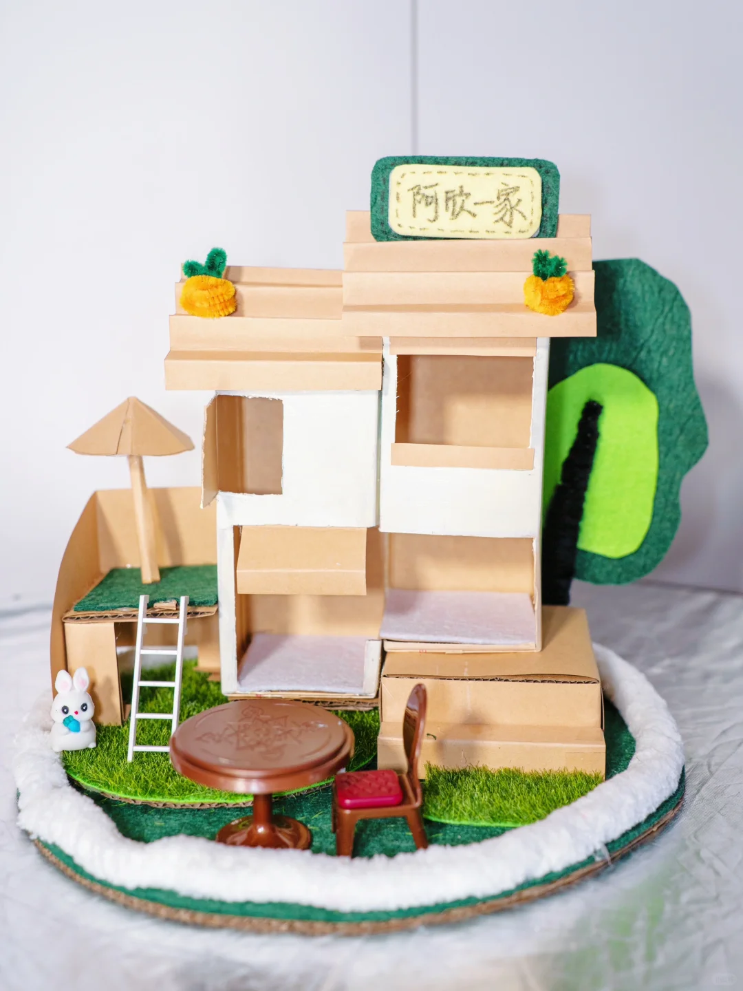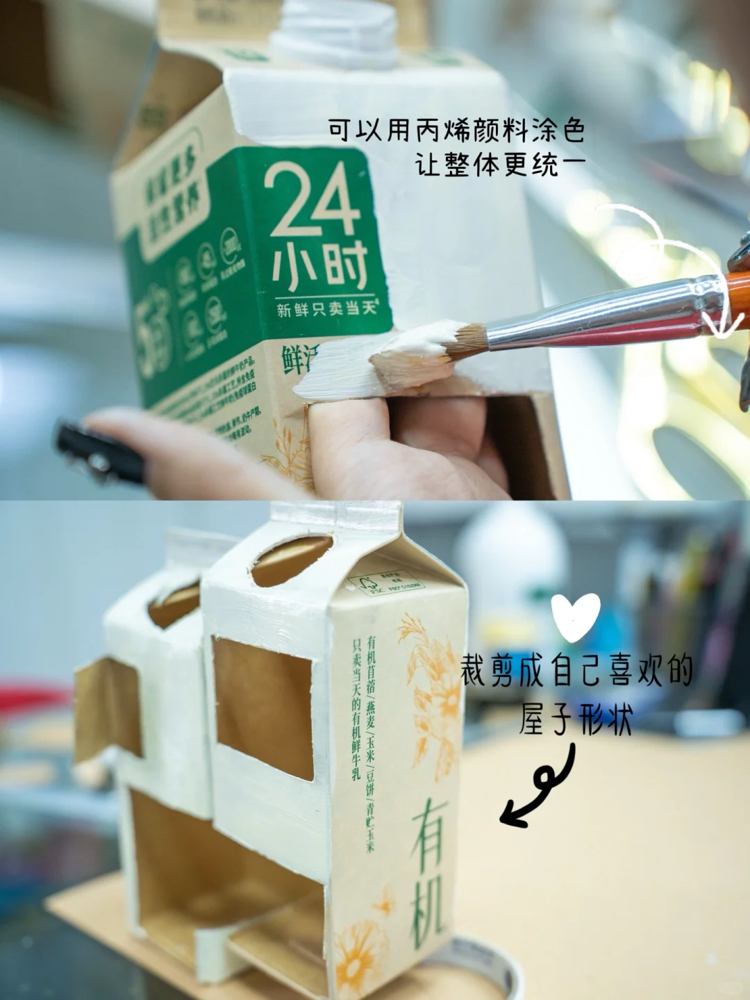 与女儿的约定在今天实现了~ 答应了很久陪女儿做个手工房子今天终于开动了~ 你的创意,妈妈帮你一起实现~因为我们平常爱喝这种大瓶的鲜奶,每天早上全家一起喝完新鲜牛奶后就将盒子保存了下来~ 就用它来做我们的大框架吧 准备材料: 牛奶盒 布织布 牛皮纸 纸板 剪刀 直尺 粗毛线 塑料草坪 热熔枪 双面胶 🔆步骤如图示☝️ 和孩子一起做专属你们的大house吧~