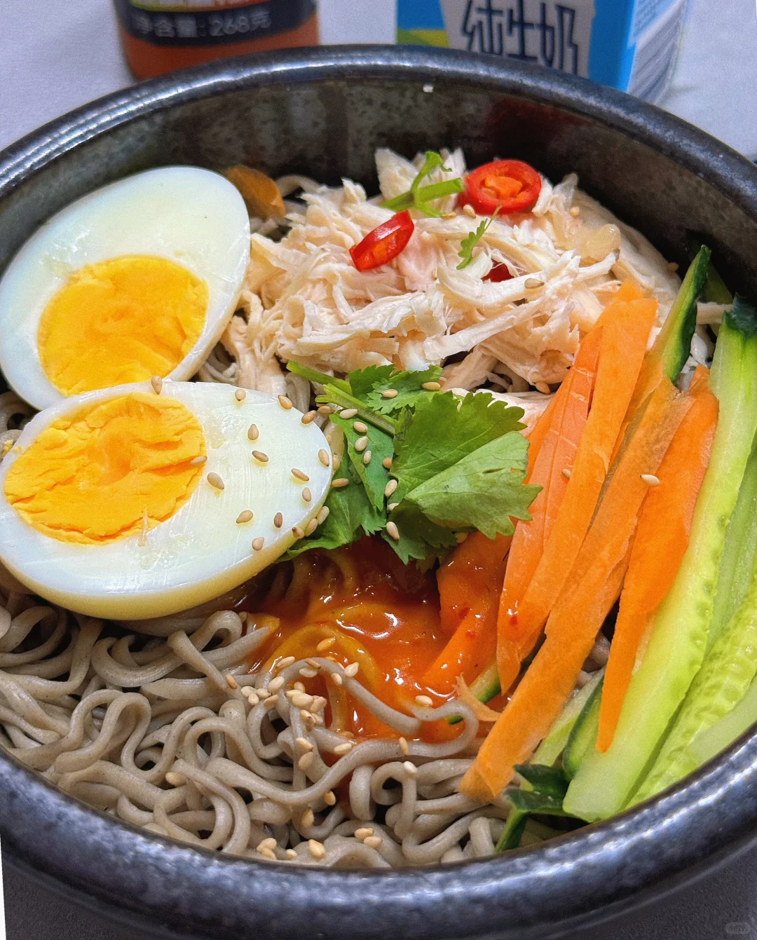 2⃣️锅中加入煮熟的荞麦面后,依次放上手撕鸡➕无菌鸡蛋➕黄瓜➕胡萝卜➕香菜。