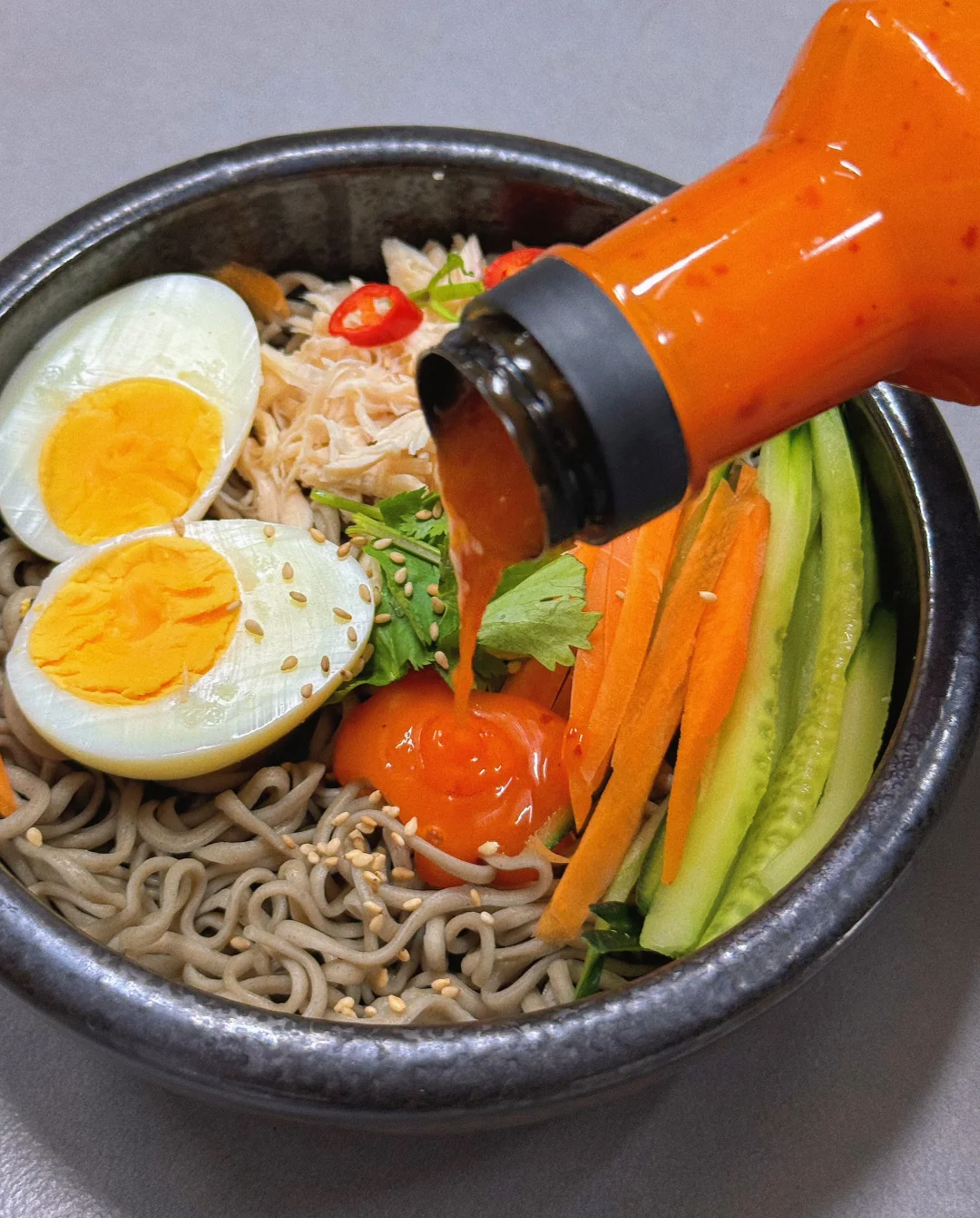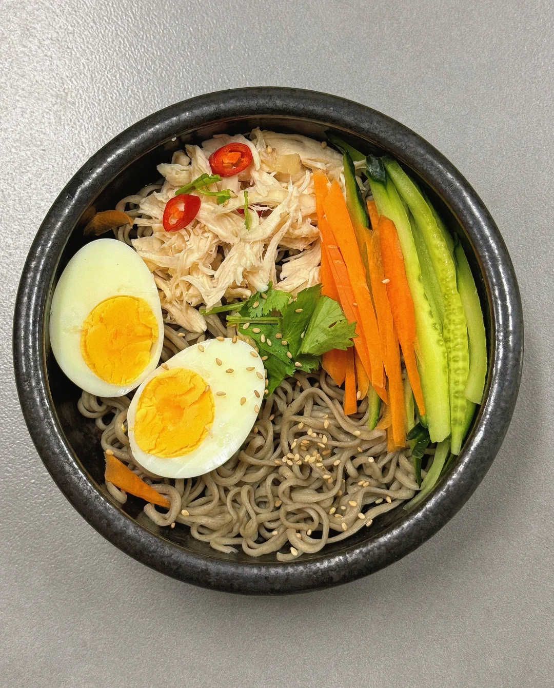 冷卡荞麦面,鸡胸肉,藤椒辣酱,醋,芝麻油,白芝麻,胡萝卜,黄瓜,香菜,小米辣,无菌鸡蛋