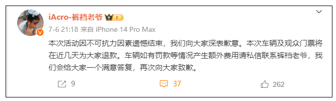 6日晚,@iAcro-裤裆老爷发布微博称活动因不可抗力结束: