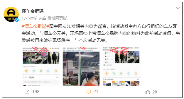 图中网友转发相关内容为谣言,该活动系主办方自行组织的车友聚会活动,与懂车帝无关。现场围挡上带懂车帝品牌内容的物料为此前活动遗留,事发后被用来维护现场秩序,与本次活动无关。