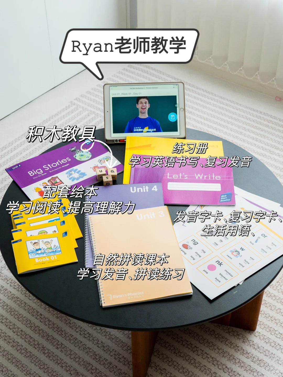 孩子学习的每个单元都有教材,练习册,打卡页和分级阅读绘本。