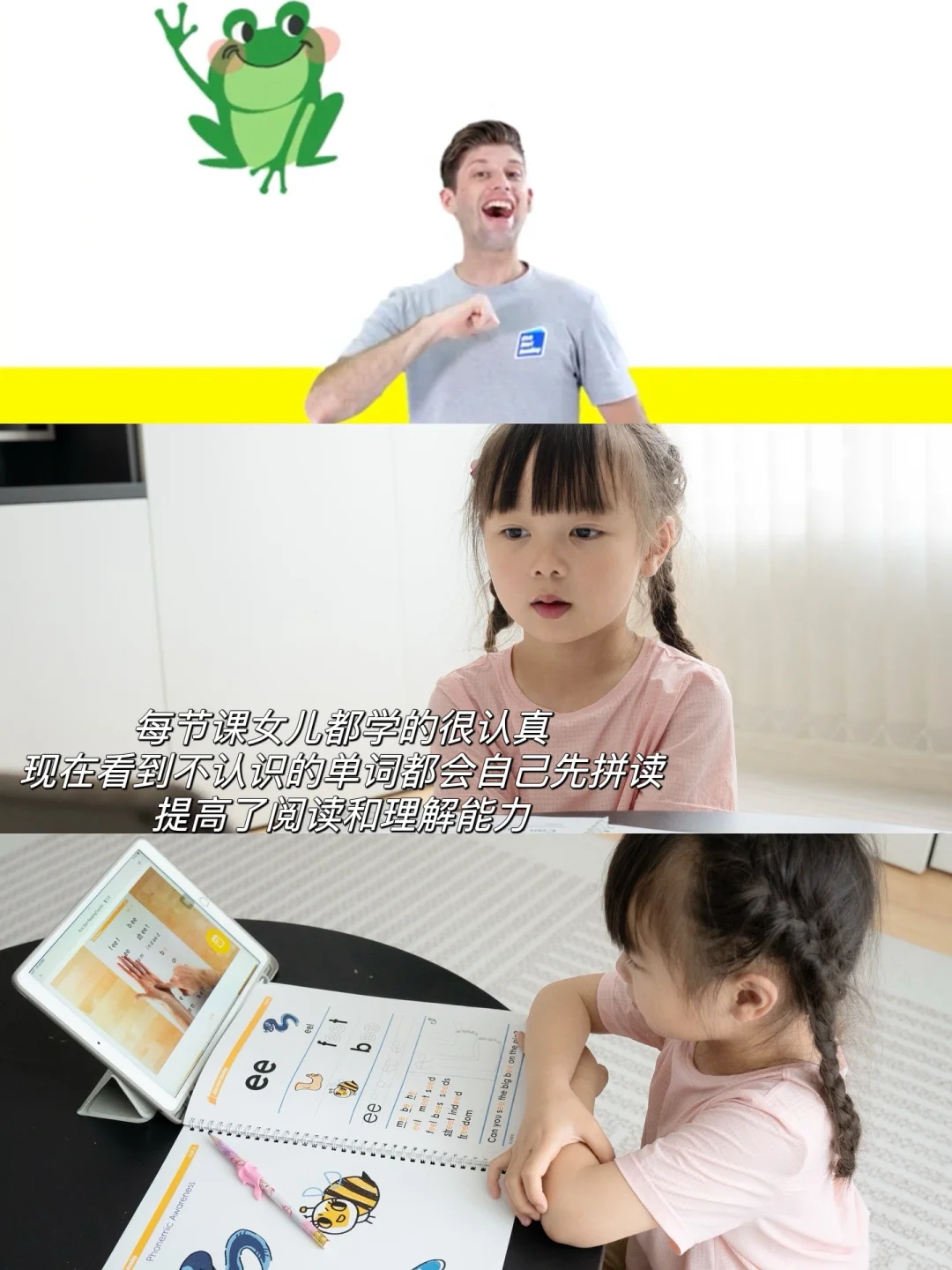 从高频音开始学习,让孩子了解音素,跟着老师一起拆分再拼读的方式去学习,课程形式生动有趣,每天女儿跟着外教Ryan老师都学的很开心,因为她爸爸英文名也是Ryan~所以学习兴趣更浓,课后录制作业视频发群里还有老师的逐一点评,现在她已经在学U3-U4单元了,在每个单元结束时会有总结课,小朋友们会和老师一起线上互动由此来检查孩子们本单元掌握的情况。孩子现在发音越来越清晰~唱歌咬字更是让我和她爸都自叹不如,她也变得越来越自信~也希望她能长期坚持下去~