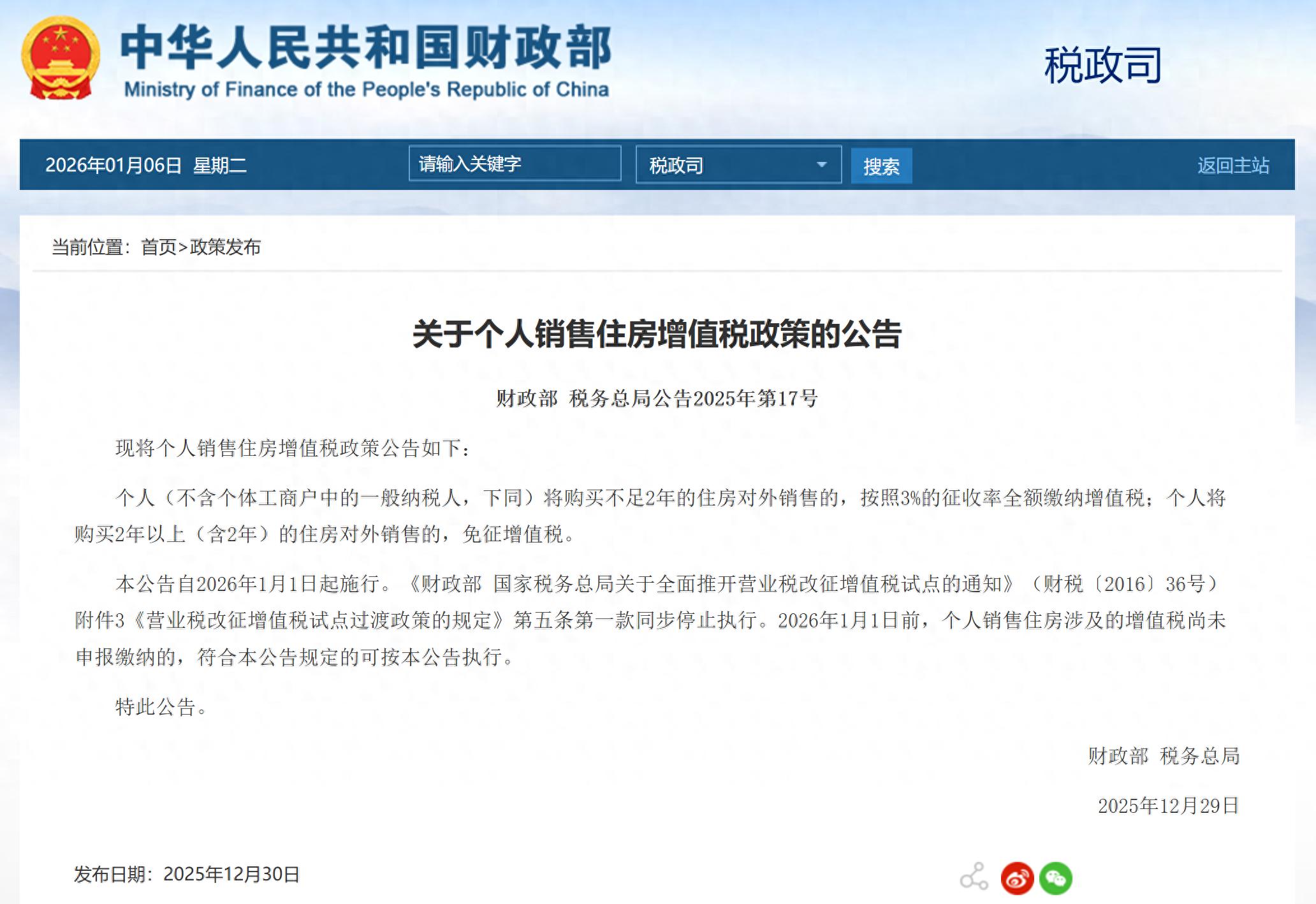 日前,财政部、国家税务总局发布的《关于个人销售住房增值税政策的公告》明确,个人将购买不足2年的住房对外销售的,按照3%的征收率全额缴纳增值税;个人将购买2年以上(含2年)的住房对外销售的,免征增值税。公告自2026年1月1日起施行,1月1日前,个人销售住房涉及的增值税尚未申报缴纳的,符合本公告规定的可按本公告执行。