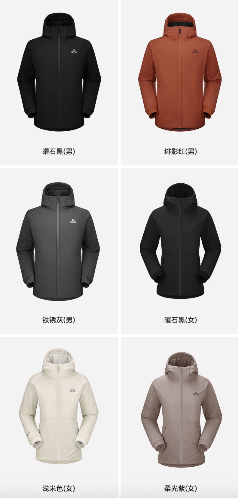 这款棉服共有6个颜色,男女同款。除100G外,还有更为轻薄的60G产品,适合作为中间层穿着,在春季和初秋也可当作外套。我选的是100G铁锈灰色。