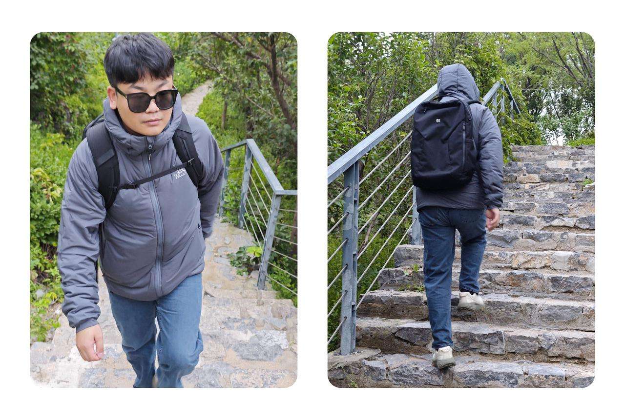此处顺便说一下,我们本次测试的户外气温是18℃,模特小哥穿着这件棉服前后长达一个小时,我本来担心他会太热捂汗,谁知完全没有。这款衣服表现出了极佳的宽幅调温能力,说明透气排湿性能十分卓越。