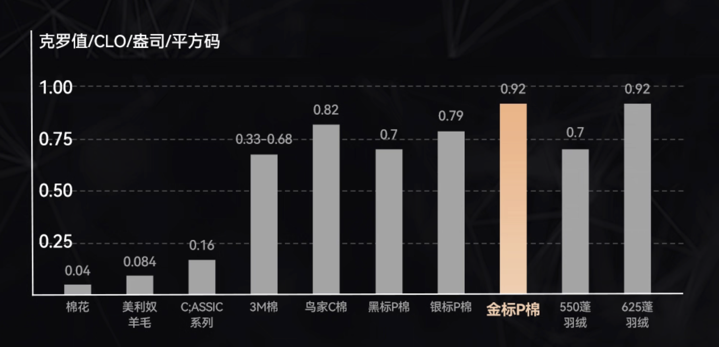实验数据显示,金标p棉在干燥状态下的克罗值为0.92clo/oz/yd²,在潮湿状态下为0.9clo/oz/yd²,只损失了0.02数值;按照平方数据统计的话,干燥状态下的数值为0.0271clo/g/m²,潮湿状态为0.0265clo/g/m²,两种统计口径下,湿水后都能保持90%以上的锁温能力。
