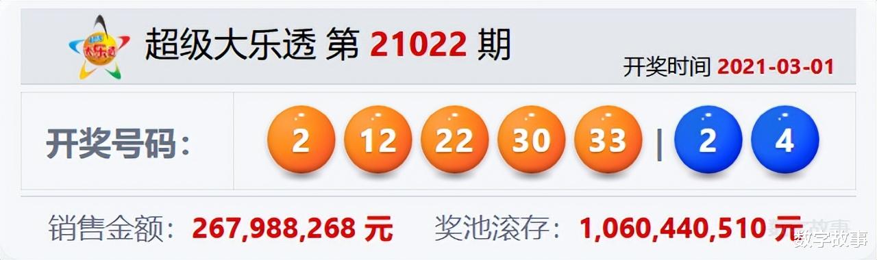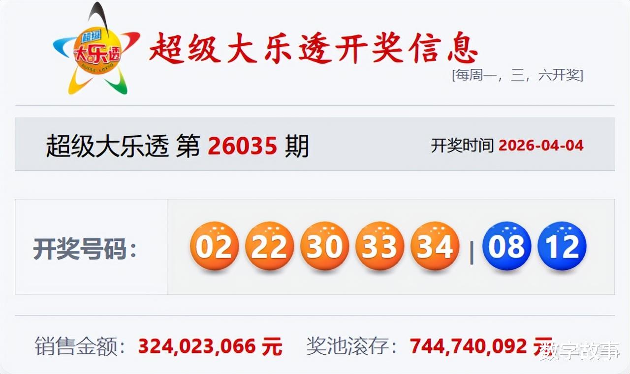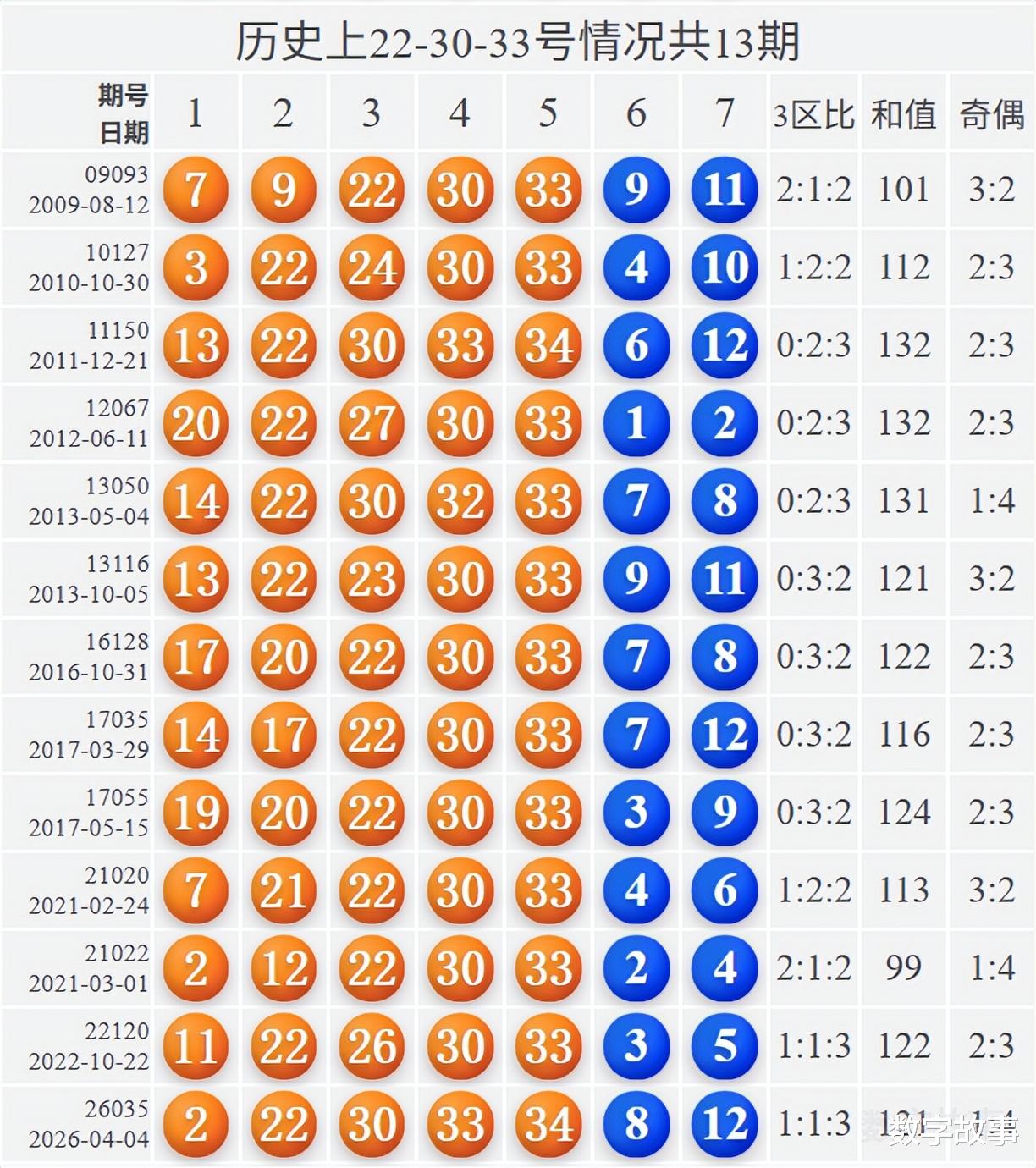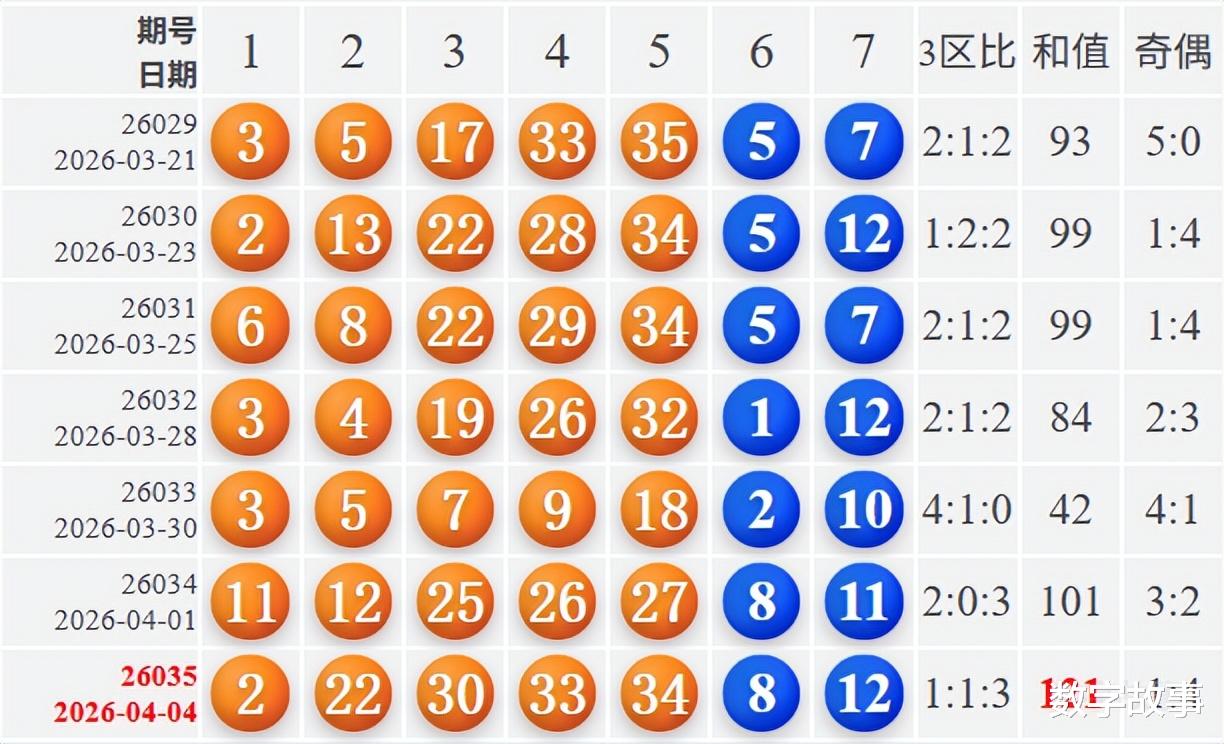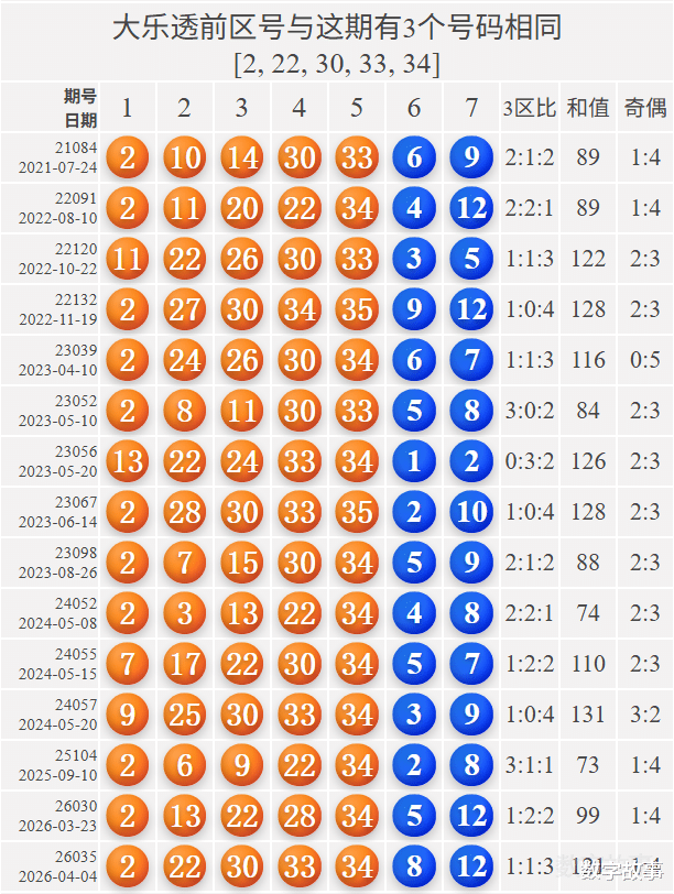 文末有大乐透前区号22-30-33, 2-30-34的历史统计。【体彩大乐透26035期开奖结果及统计】前区号组合历史上有4期四球相同,后区8-12中断36期遗漏;11注一等奖,奖池7.447亿。大乐透26035期开奖结果及中奖情况:出奖时间: 2026-04-04 星期六 前区号:2-22-30-33-34大乐透后区号:8-12后区重号叠码:8前区奇偶比:1:4 前区和值:121前区跨度:32 三区比:1:1:3连号: 33-34
