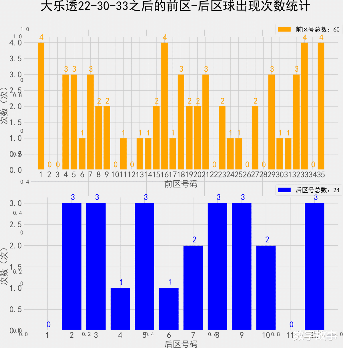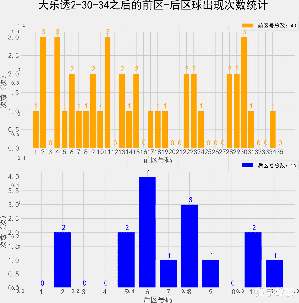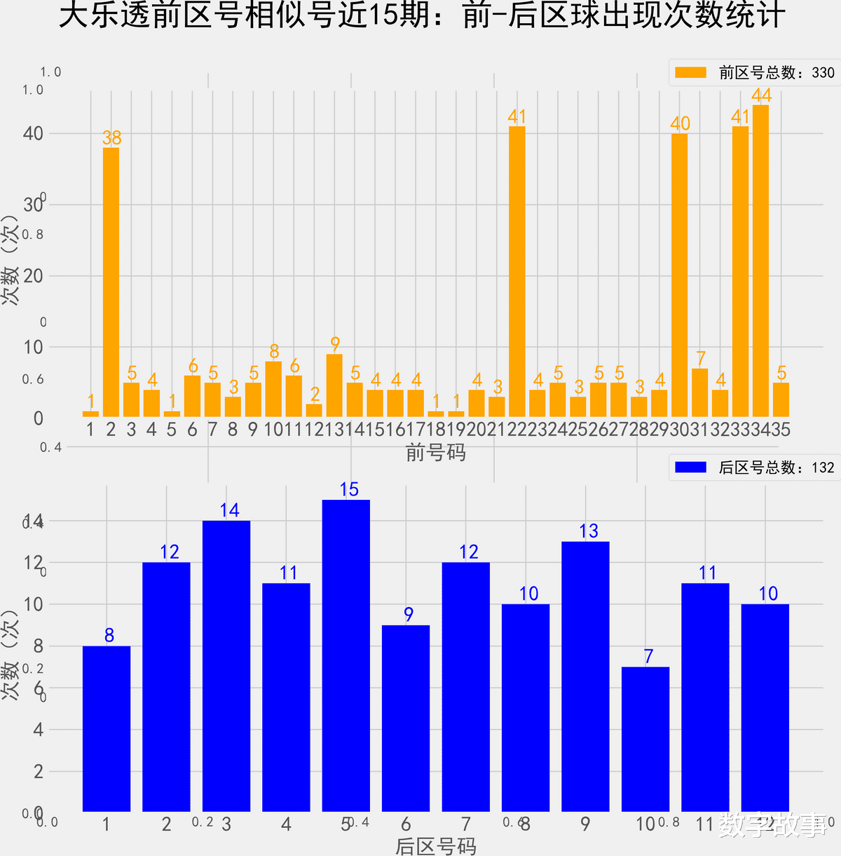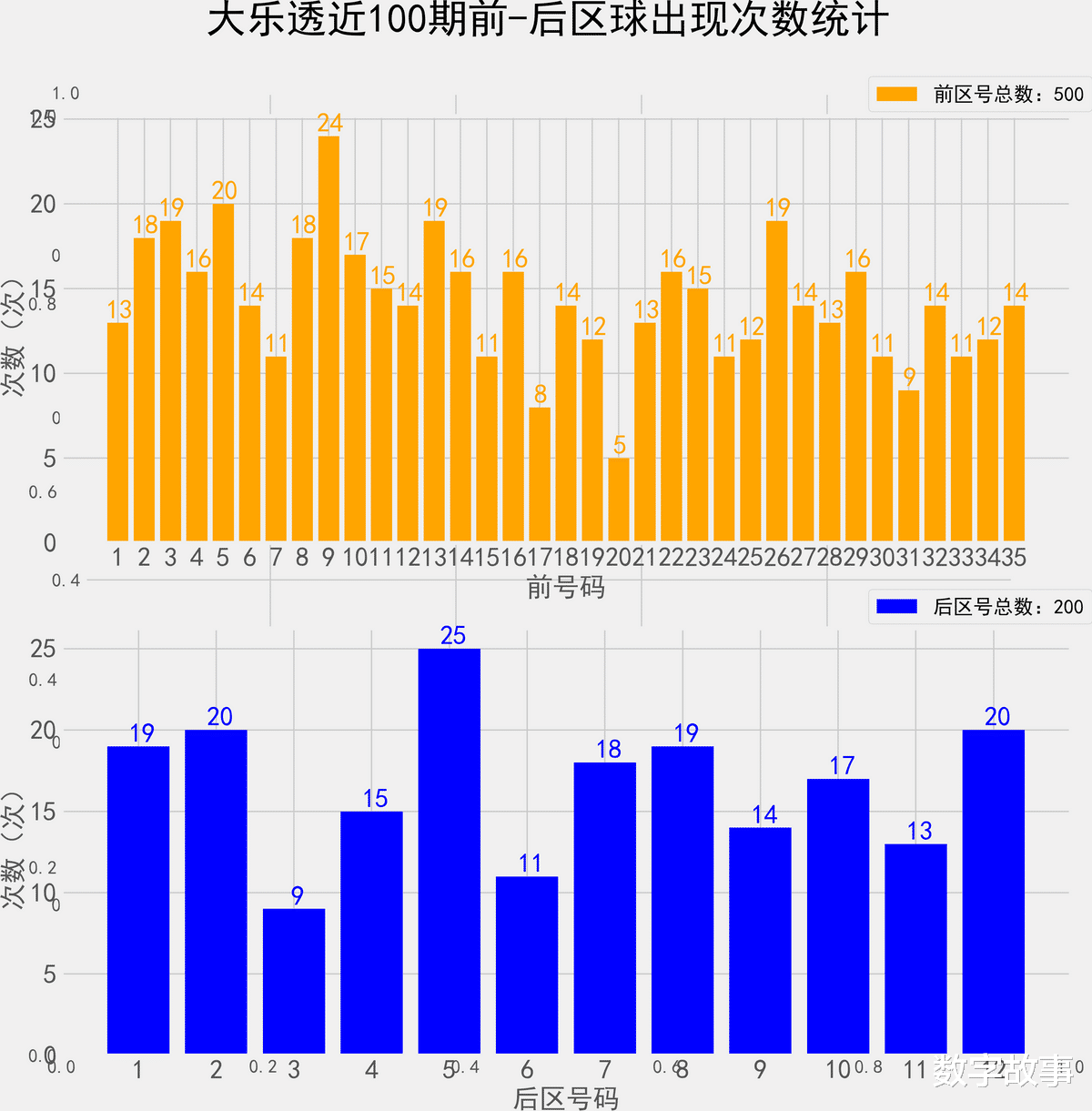 大乐透近100期前后区号统计情况统计样本数据: 500个前区号码 200个后区号码