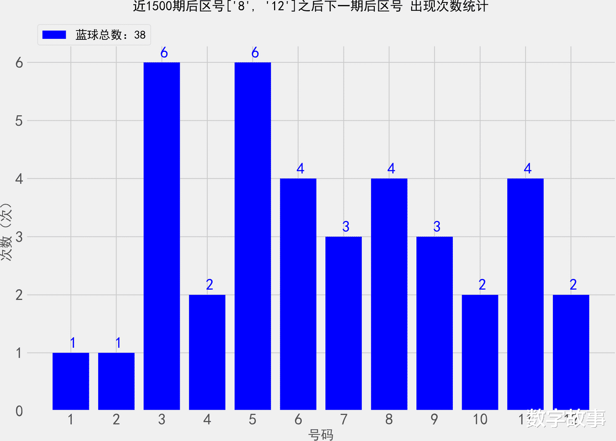 统计近1500期后区号8-12之后, 各后区号的出现次数大乐透26035期后区号是8-12找出近1500期后区8-12号之后,下一期出现的所有后区号,统计其出现次数。除开这一期,共出现了19次8-12后区号那么统计的样本数据是38个