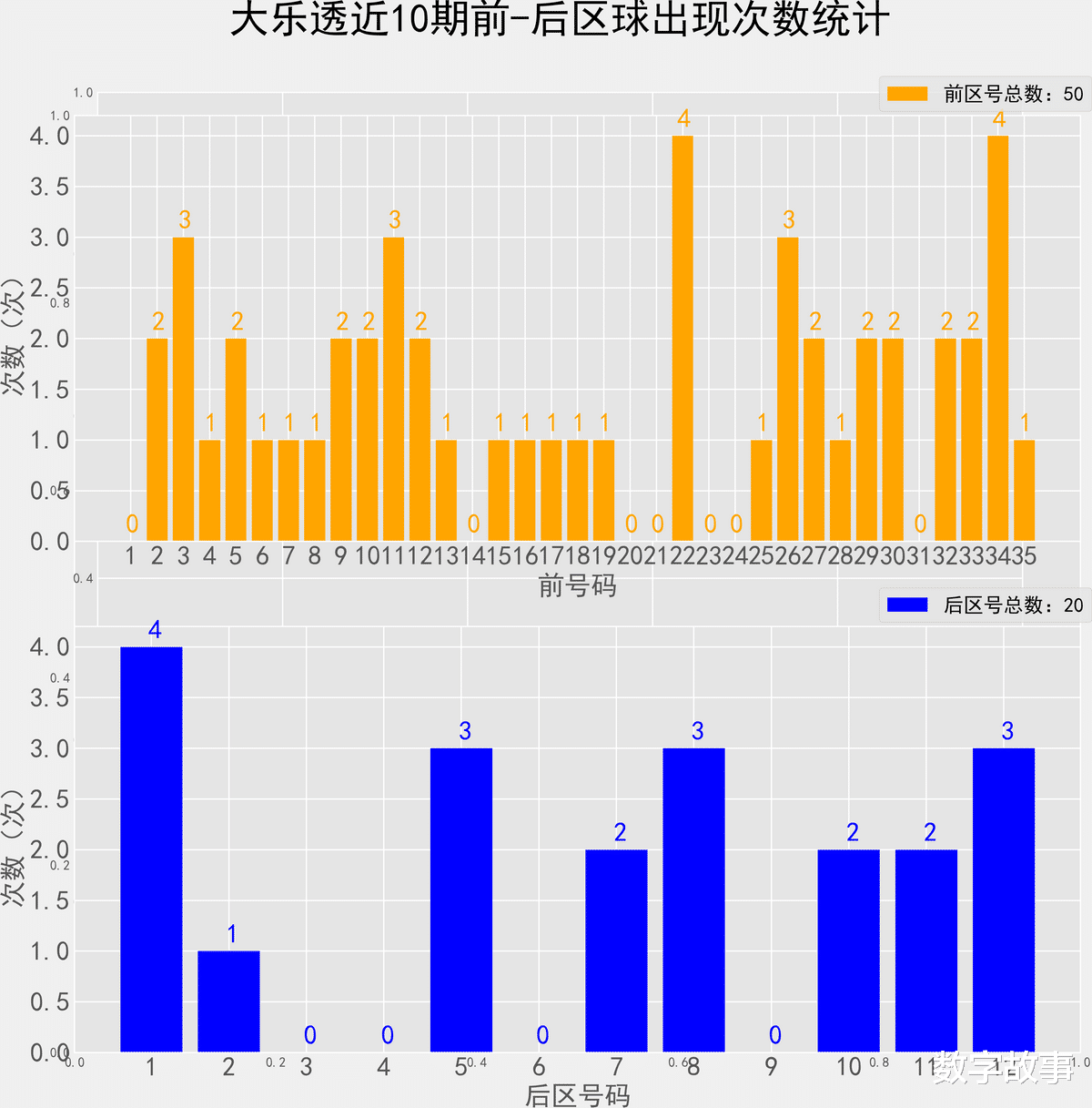 大乐透近10期前后区号统计情况统计样本数据: 50个前区号码 20个后区号码