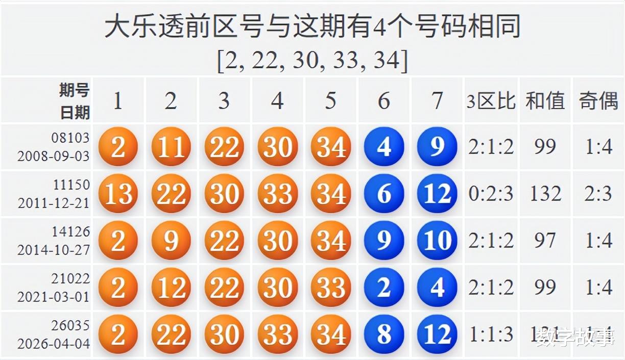 大乐透26035期前区号在过去是否出现过?大乐透26035期前区号: 2-22-30-33-34经查,历史上没有出现过与这一期5个前区号一样的,4个前区号一样的有4期,如下: