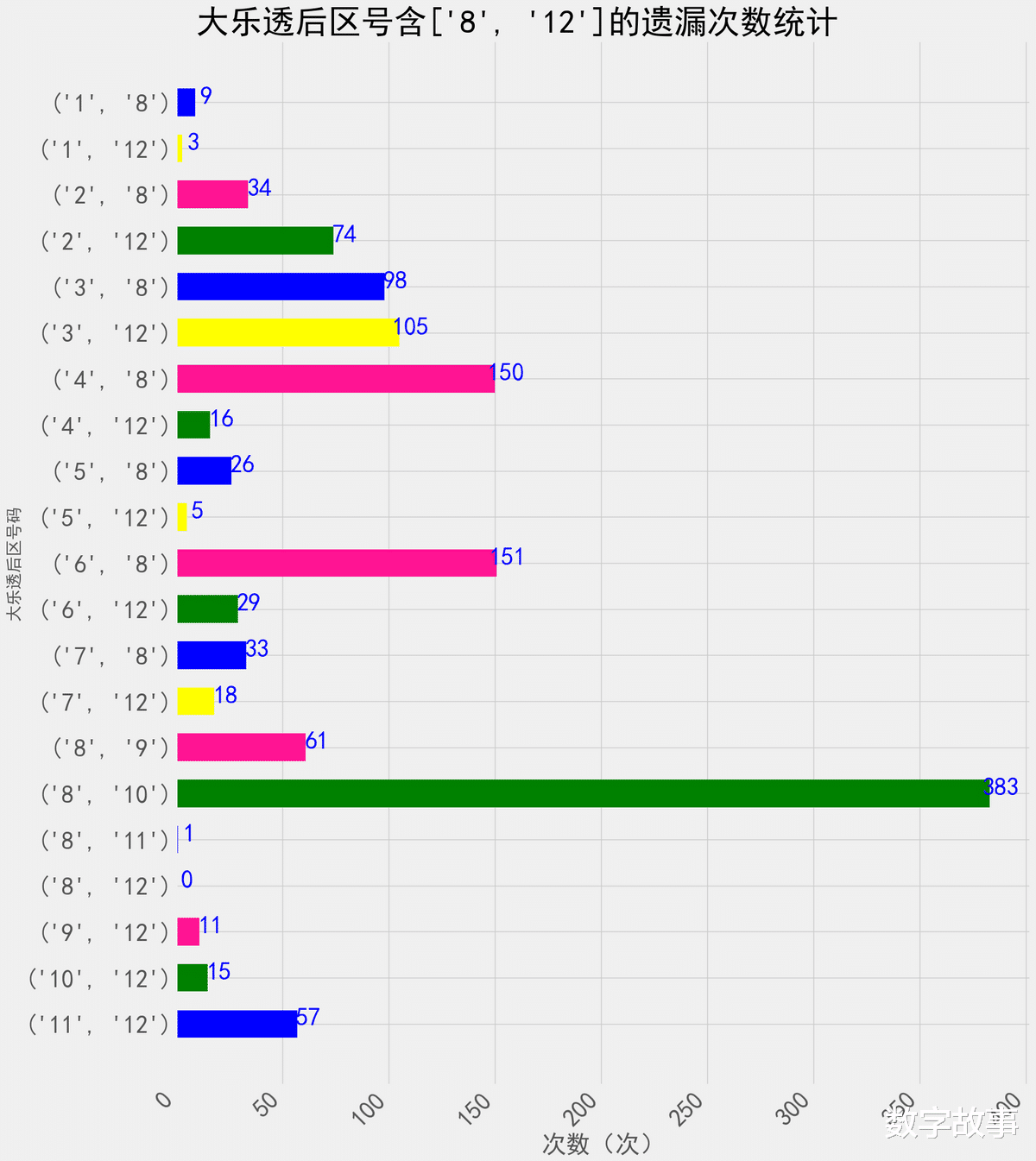 大乐透后区含8或12的双号遗漏次数统计大乐透后区组合8-12近150期出了3次,这次中断了36期遗漏。