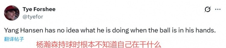 本场比赛结束后,杨瀚森着实被骂惨了,上方截图都是国外球迷在社媒喷他的,“杨瀚森真菜,根本不配首轮选秀权”,“杨瀚森在场上被打爆了”,“杨瀚森持球时根本不知道自己在干什么”。国内球迷更不用说,各大社媒平台清一色的差评,骂的比国外球迷难听多了。但本场比赛小杨并不是没有进步,戈塔特掩护,篮板球背人,这些都能看得出来比之前好多了。只不过没有把握住投篮的机会,防守端脚步慢的问题没有得到改善。