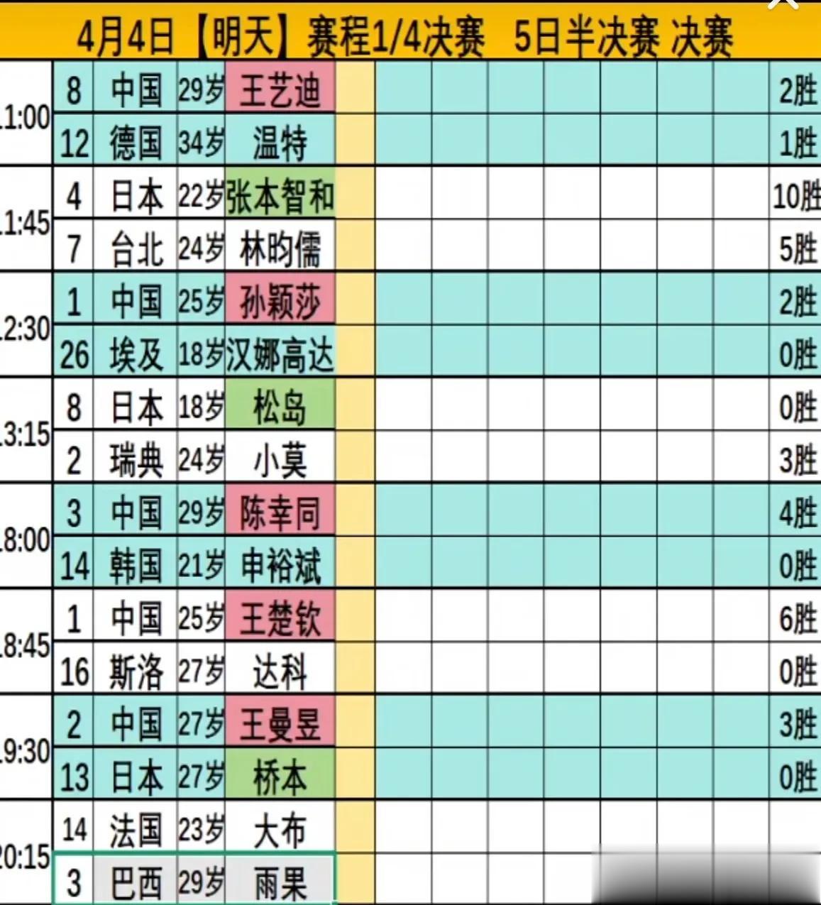 刚刚结束的乒乓球澳门世界杯男单1/8决赛第七、第八场比赛,中国王楚钦4-2战胜法国小勒布伦,卫冕冠军巴西雨果4-3绝杀日本户上隼辅锁定最后两个八强席位!男单1/4决赛最新赛程,北京时间4月4日⬇️⬇️18:45,中国王楚钦vs斯洛文尼亚达科;