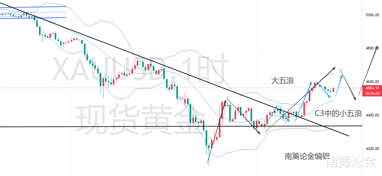 小时图当中,可以看到现在行情有一部分可以依据的技术面,比如小时图中形成的五浪雏形,目前在走第三浪。上午的直播当中进行测算,如果要走波浪结构,那么第三浪是最长的,至少要高于第一浪反弹出来的 450+。也就是说,这一轮逻辑至少要冲击到 4700 之上才有可能维持这个五浪的走法。