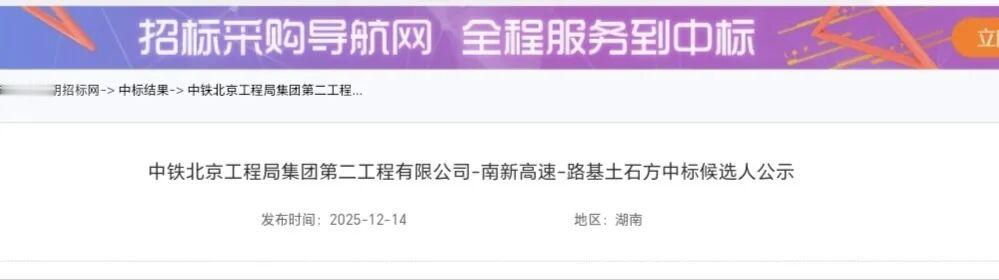 12月14日,中铁北京工程局集团第二工程有限公司-南新高速-路基土石方中标候选人公示。