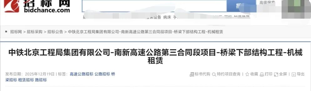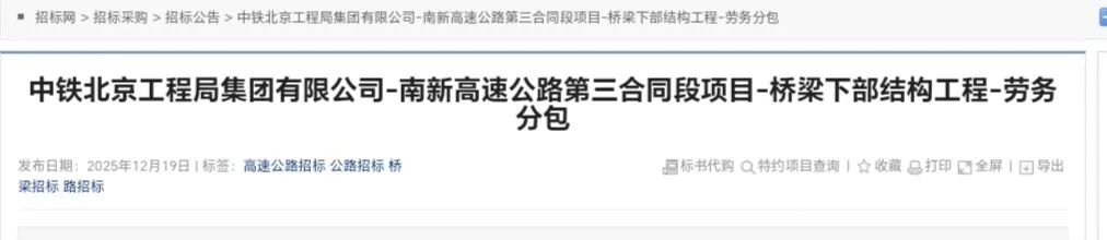 12月19日,南新高速公路第三合同段项目-桥梁下部结构工程-劳务分包以及机械租赁等公告发出。