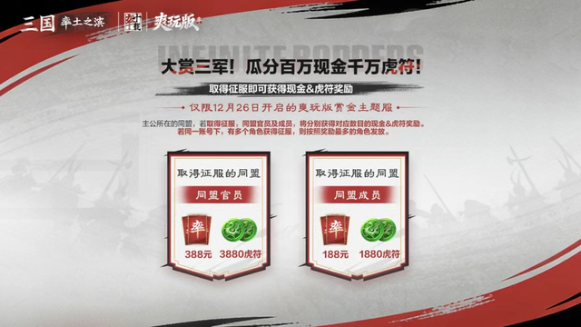 其次是赛季打得好,直接发现金!拿下“征服”或“割据”的联盟和个人,除了常规奖励,还能额外领现金+虎符。官员能拿388元+3880虎符,成员也有188元+1880虎符!