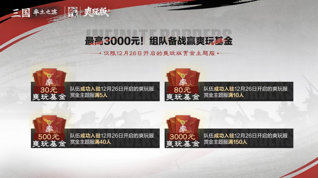 12月26日,《率土之滨》“爽玩版赏金主题服”正式上线,不搞邀请赛、不设门槛,只要你进服、建号、打地、组队,就有机会拿钱。这不是电竞比赛只给大神发奖,而是全民都能参与的“快乐分钱局”。
