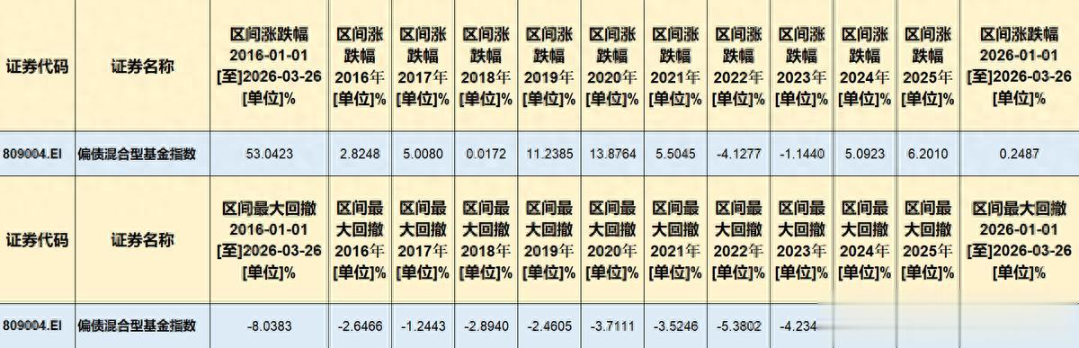 最大回撤相对有限:与稳健收益相对应的是,偏债混合型基金指数在风险控制方面表现也很不错。2016年至2026年3月期间,指数最大回撤仅为-8.04%,远低于同期沪深300指数约-45.6%的最大回撤水平。