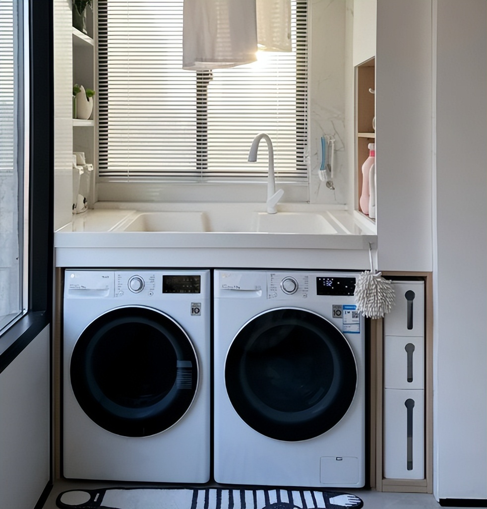 阳台打造洗衣区,提前做好上下水,将洗衣机和烘干机都可以放在这里,洗衣服、晾晒衣服都很方便。